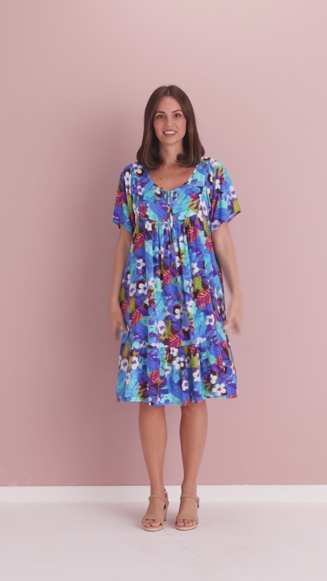I read that you need to go up a size if you are fairly big in the bust line. Glad I did. Don't be alarmed if you need to press the fabric before you wear it. It comes up trumps after ironing after all its rayon. It makes me feel nice as its a great length for me as I am 5'4" . It is a great dress to hide the bumps in the belly area.