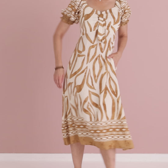 Fresh, uplifting and effortlessly feminine, the Adelina Puff Sleeve Dress in Sand Botanical brings a modern twist to a classic summer silhouette. The square neckline and centre tie detail add extra charm, and the soft puff sleeves offer gentle arm coverage without feeling restrictive. Cut from a smooth, lightweight woven fabric, it skims the body comfortably and falls to a breezy midi length – perfect for warm days, weekends away and relaxed lunches. Simply pair with sandals or wedges for an easy, confident look that suits the Australian summer.