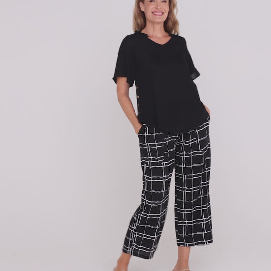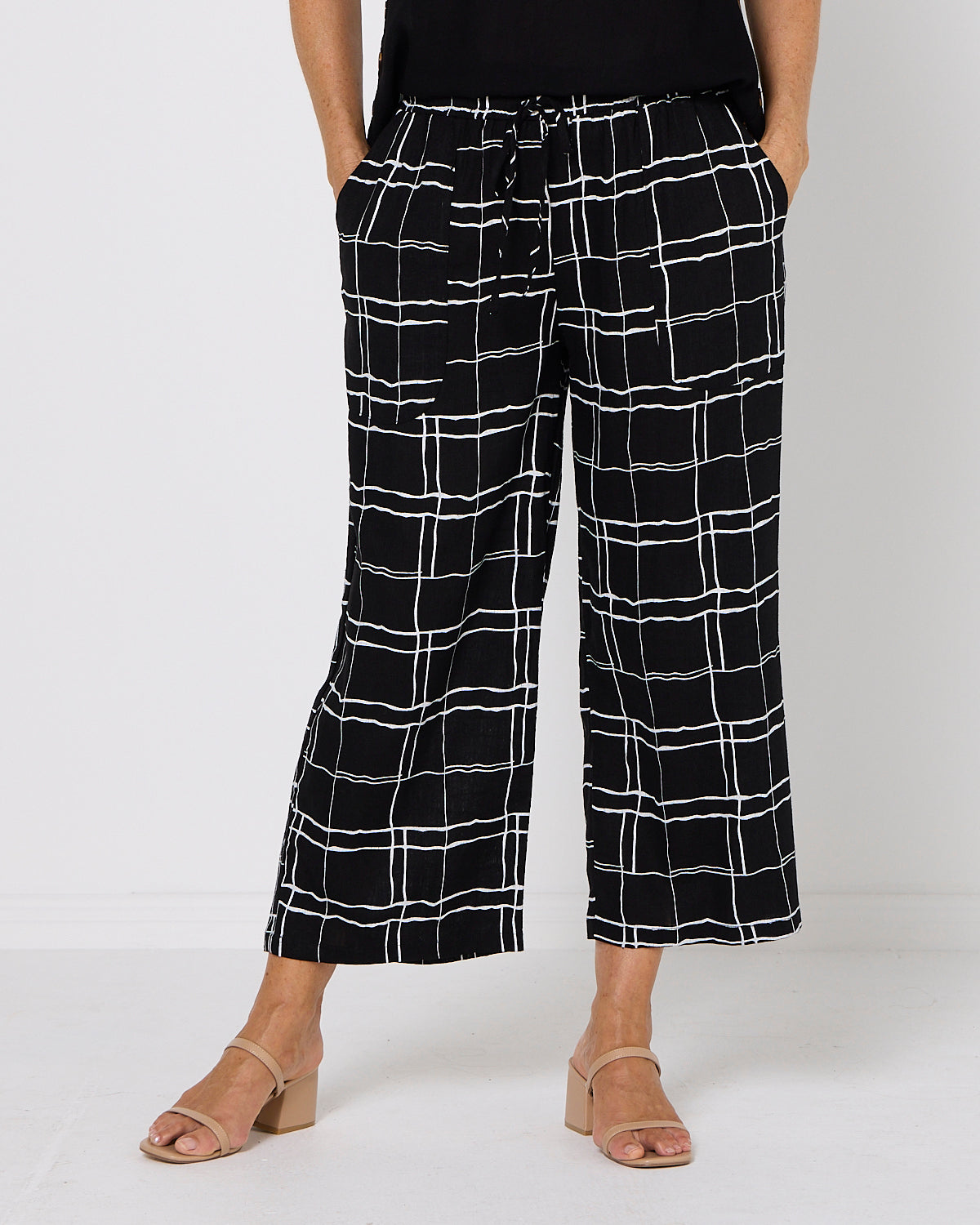 Playful yet effortlessly wearable, the Aiko Linen Pants in Black Check Print offer a modern take on relaxed linen dressing. The bold black base is balanced by an abstract white check, creating a statement look that still feels classic and easy to style. Crafted from a breathable linen blend woven fabric, these pants have a natural texture and soft drape that moves beautifully through the leg without clinging.