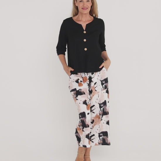 Earthy, artistic and effortlessly wearable, the Aiko Linen Pants in Espresso Abstract bring a fresh update to this much-loved silhouette. Featuring a striking painterly print in warm brown, soft beige and inky black, this colourway feels both modern and timeless. The wide elasticised waistband with drawstring offers all-day comfort, while the relaxed wide-leg culotte shape creates an easy, flattering drape through the leg. Crafted from a linen blend woven fabric, these pants hold their shape beautifully without cling. Style them with a simple white tee, soft knit or linen shirt for everyday polish, or dress them up with wedges and statement jewellery for long lunches, travel days or relaxed evenings out.