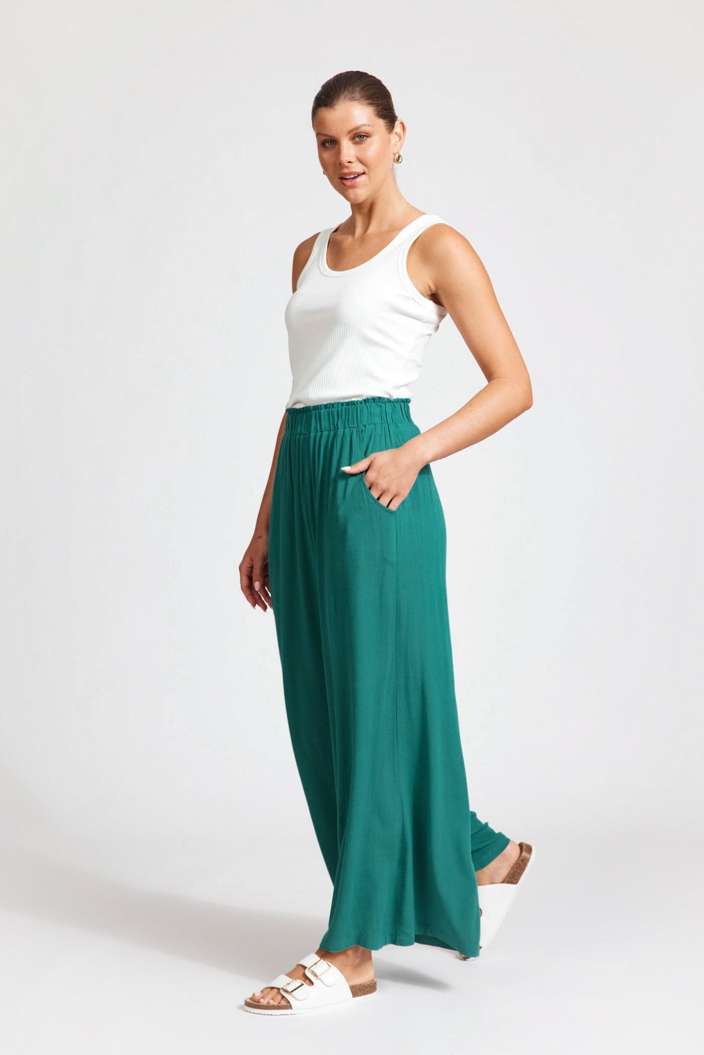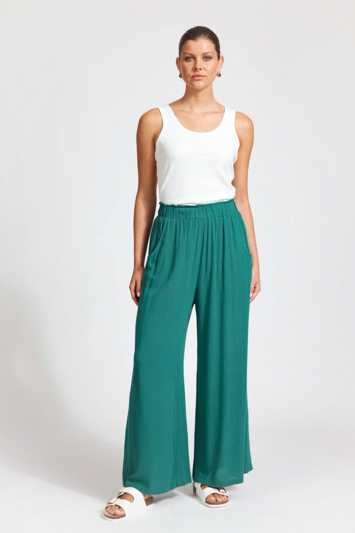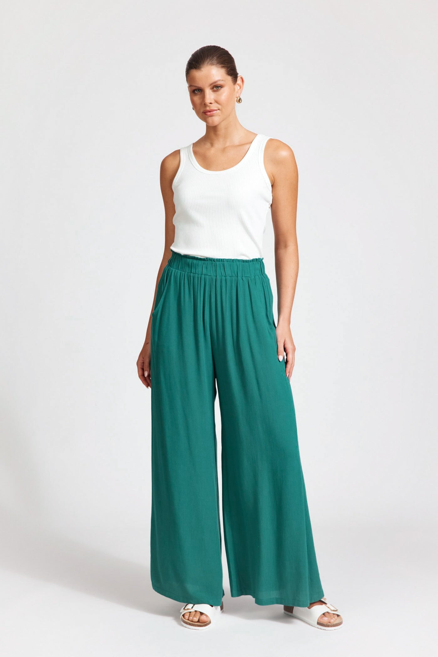Elevate everyday comfort with the Alegria Palazzo Pant in rich Lagoon. Cut from softly draping viscose, this wide-leg style moves beautifully and skims the figure without cling. A flat front with elastic through the back makes for an easy pull-on fit, while side pockets add that practical touch we all love. Dress them up with a silky cami and wedges for dinner, or pair with the matching Alegria Twist Top and slides for chic resort style—from long lunches to holidays away.
