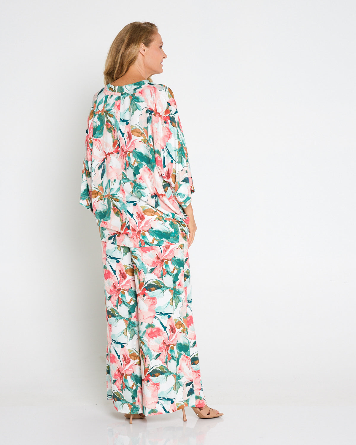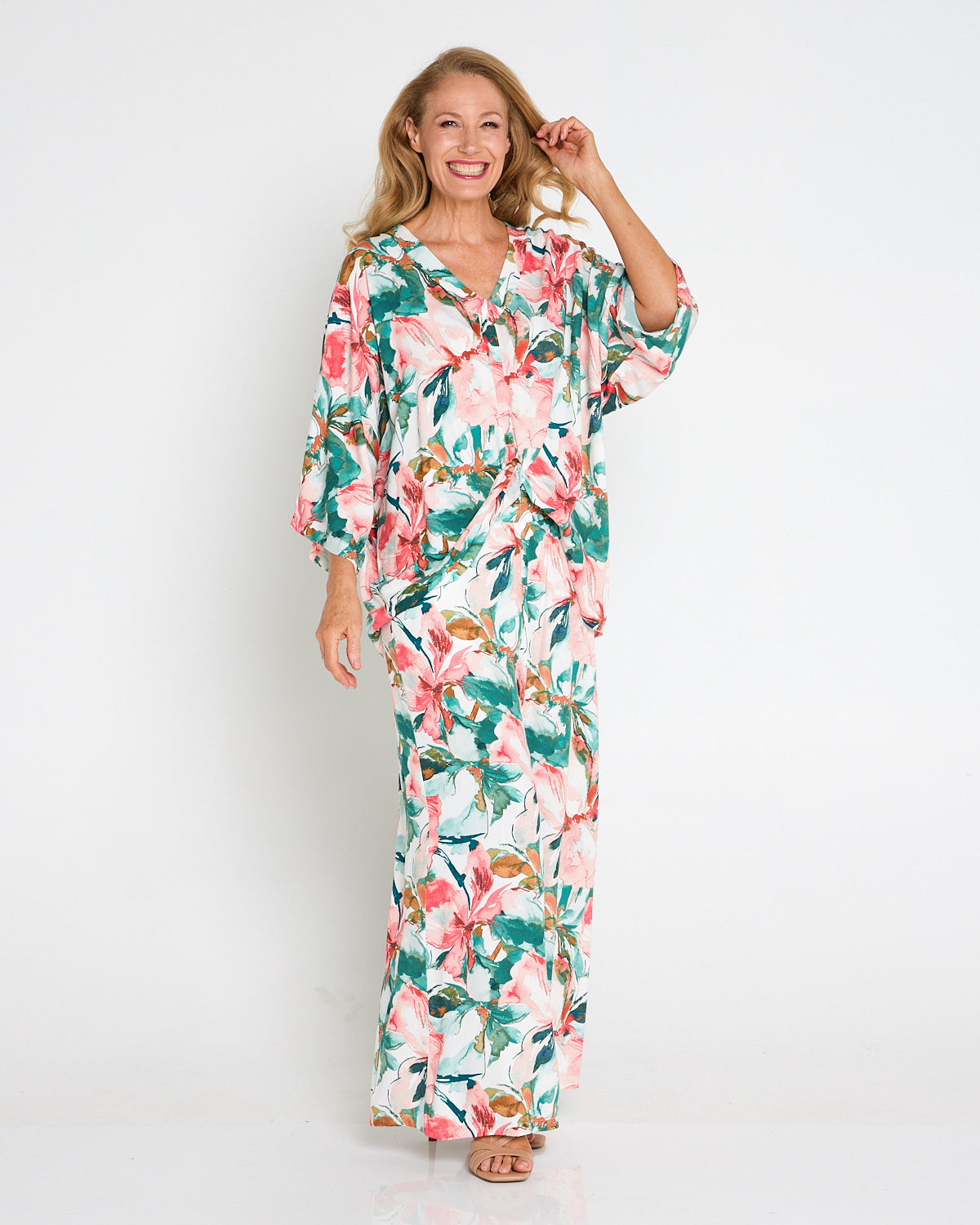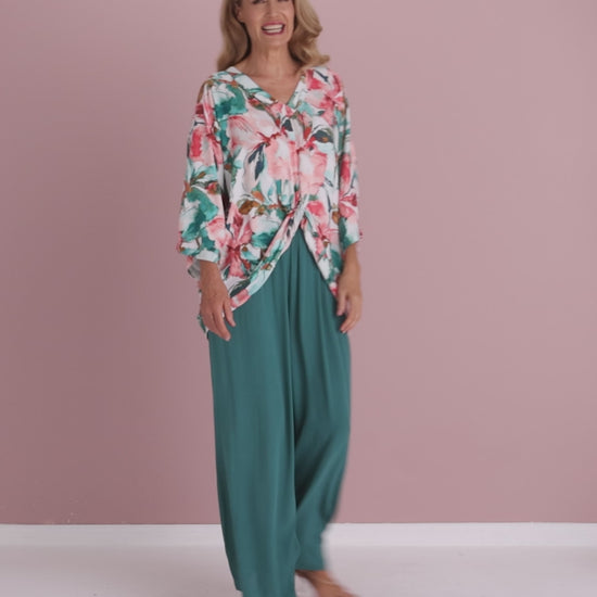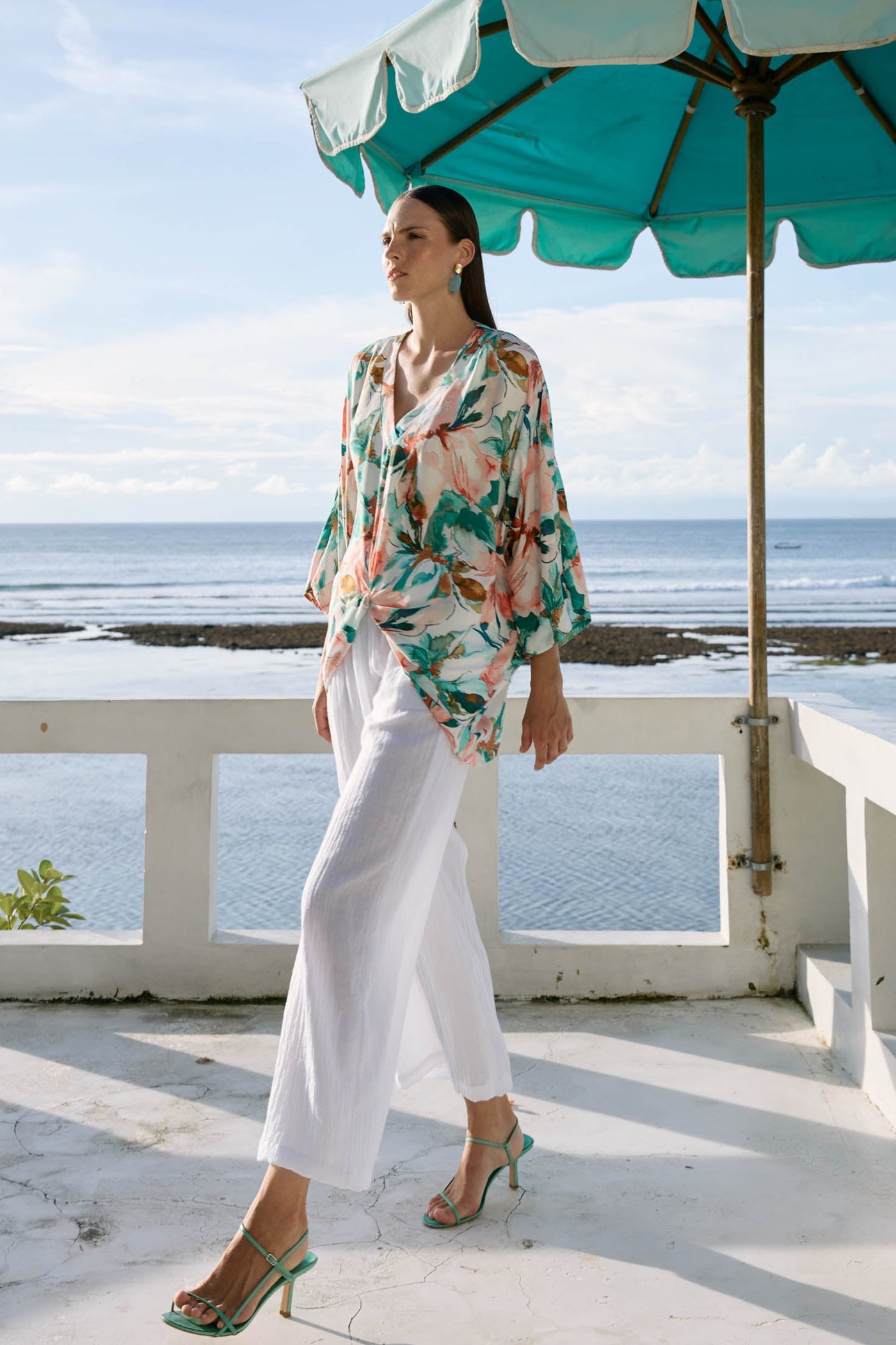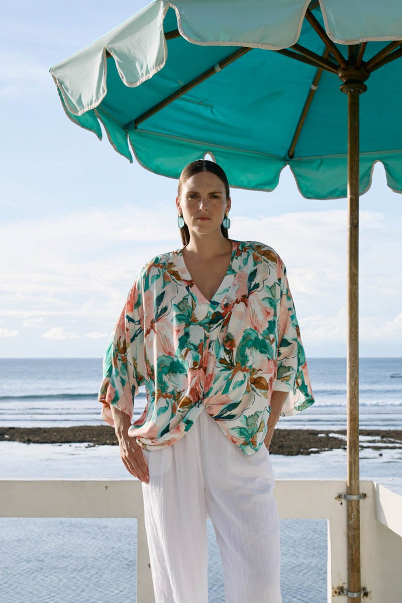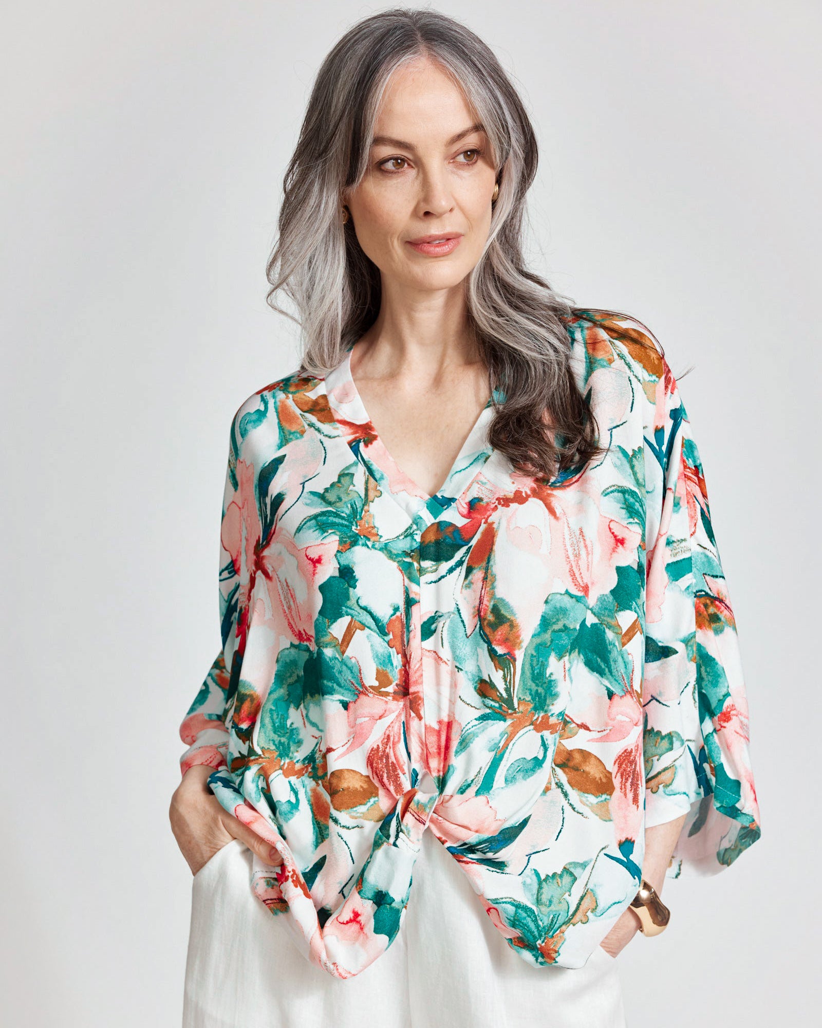 Fresh, painterly florals meet an easy drape in the Alegria Twist Top. The Estate print blends soft blush, coral and teal on a light crepe feel that floats over the body without clinging. A clever front twist creates gentle shape through the waist while keeping the fit relaxed and forgiving—perfect for long lunches, weekends away and anything in between. Style it with wide-leg pants for a resort look, or dress it down with denim and slides.