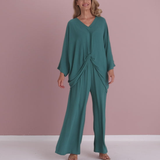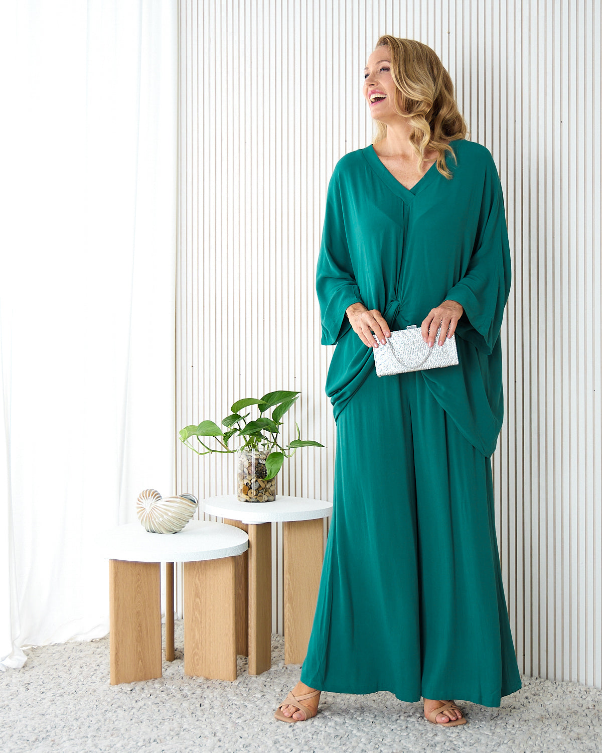 Infuse your wardrobe with the rich Lagoon hue. This best-selling Alegria silhouette drapes beautifully in soft crepe-feel viscose, with a clever front twist that draws the eye and adds gentle waist shape while keeping the fit relaxed. The V neckline flatters the décolletage and the extended kimono sleeves offer easy coverage. Match with wide-leg pants for a chic set, or team with denim and slides for effortless weekend polish—ideal for lunches, getaways and warm evenings.