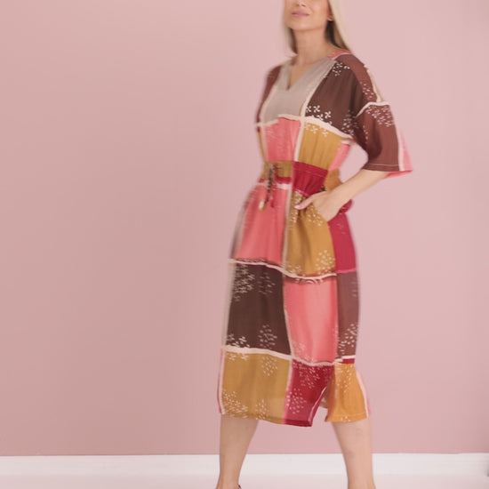 Sun-washed blocks of coral, bronze and blush give the Allena Kaftan Dress its artful, wanderlust feel. Cut with a relaxed kaftan silhouette, it skims beautifully while an adjustable drawstring defines the waist for shape when you want it. A soft rayon lining adds coverage without weight, and the airy outer has a gentle texture that moves as you do. Slip on wedges and a basket bag for lunches, holidays or any warm-weather occasion where comfort and polish are a must.