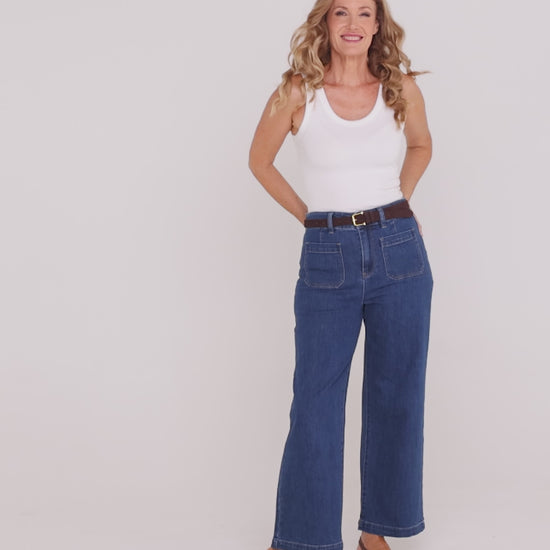 The Alyssa Front Pocket Jeans by Elm is a fresh take on classic denim, designed for comfort and everyday confidence. The flattering high-rise fit smooths and supports through the waist, while the wide leg silhouette creates a balanced shape that works beautifully with everything from fitted tees to relaxed knitwear. The mid wash denim feels timeless and easy to style - a true wardrobe staple for women’s fashion Australia.