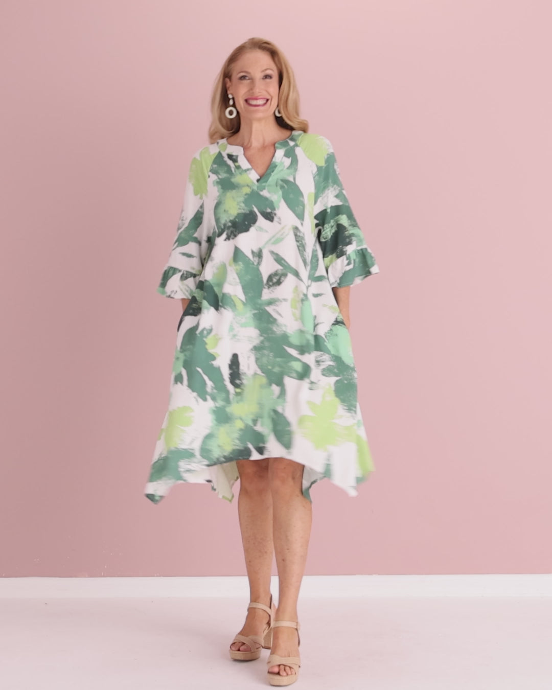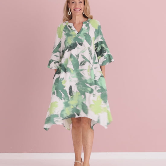 The Amadi Dress in Verdant Green brings fresh, painterly colour to everyday dressing. Featuring an expressive botanical-style print in layered greens on a soft ivory base, this style feels uplifting yet easy to wear. Crafted from a breathable linen-cotton blend, it has a natural textured hand feel that suits warm days without clinging. The relaxed silhouette drapes effortlessly, enhanced by a flattering notch neckline, ruffle-trim elbow-length sleeves and an asymmetrical hem that creates gentle movement as you walk. Finished with practical side-seam pockets, this is a throw-on-and-go dress that works beautifully for daytime outings, casual lunches, travel or relaxed weekend plans. Style with wedges or sandals and simple accessories for an effortlessly polished look.