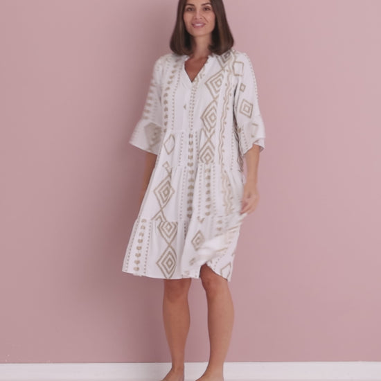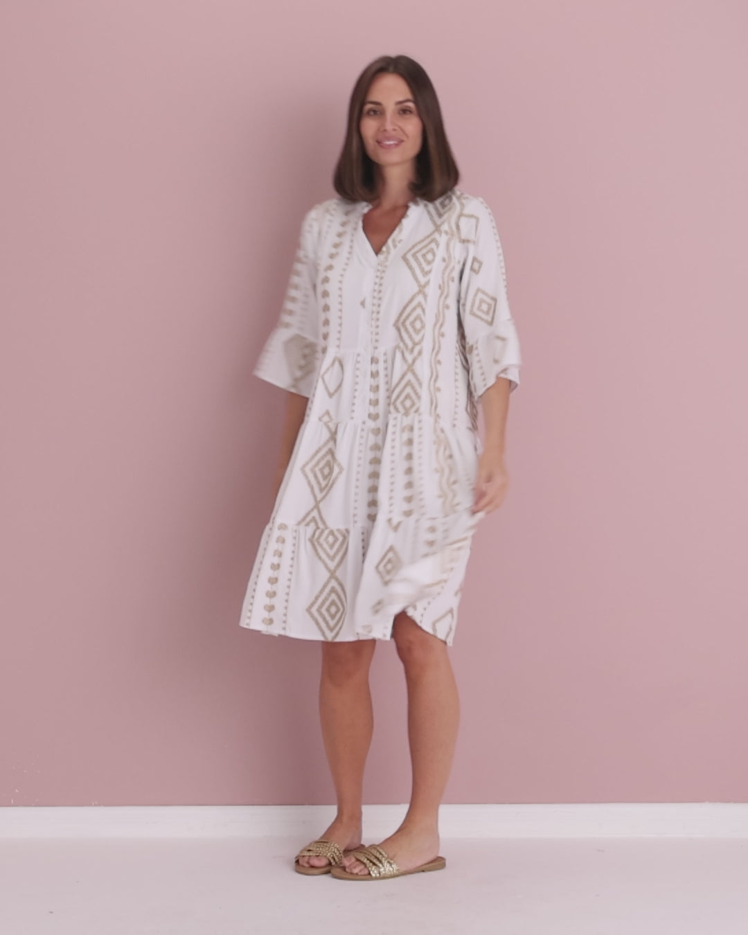 A sun-kissed statement for warm days, the Amalfi Gold Embroidered Dress blends relaxed ease with resort polish. The soft rayon drapes beautifully and lets the intricate gold embroidery take centre stage, while the tiered skirt moves with you. Falling just below the knee, it’s the perfect length for petites—no hemming needed. A notched neckline and gentle fluted sleeves add feminine detail, and of course, there are pockets. Slip on sandals for brunch, or dress it up with gold jewellery for sunset drinks.