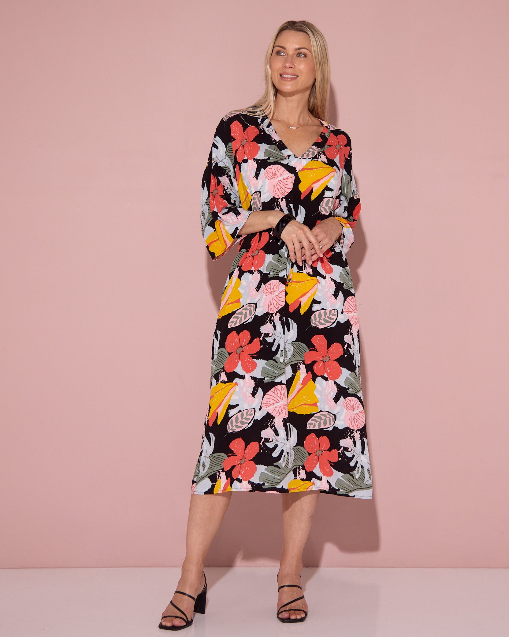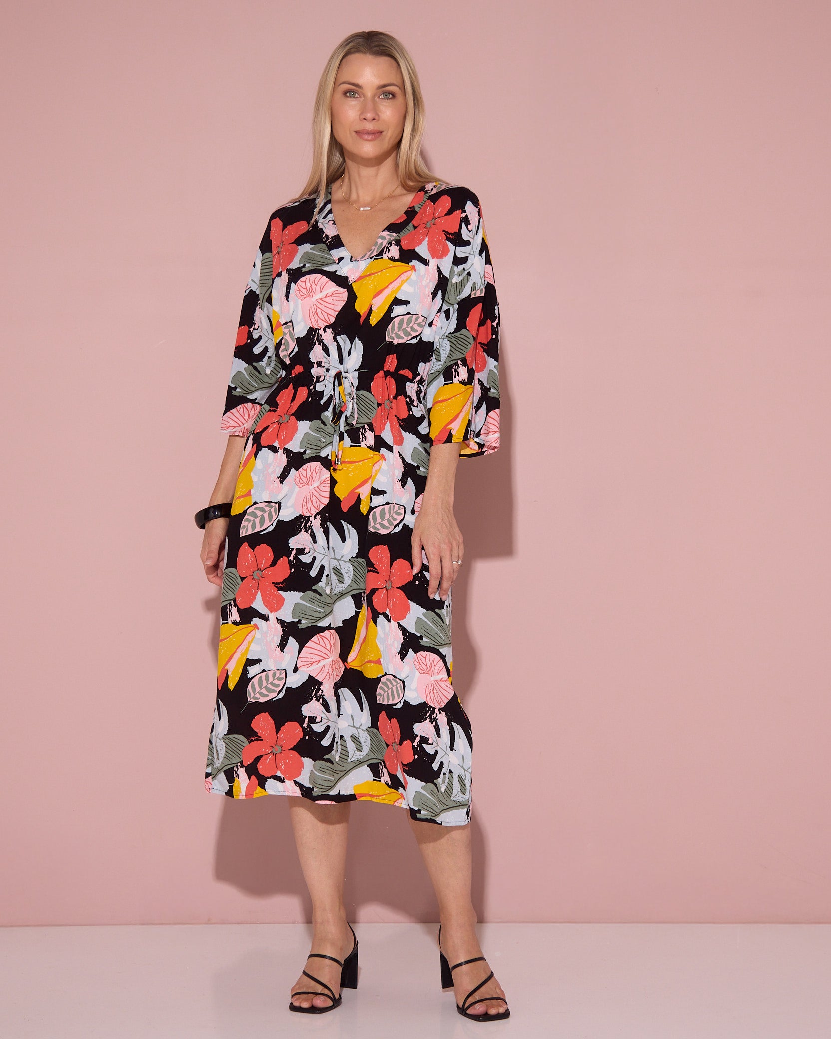 The Ana Dress in Tropical print is an instant mood-lifter, blending vibrant florals and lush foliage on a deep black base for a bold summer statement. Crafted from a soft, breathable woven fabric, it feels light and airy for warm-weather days. The V-neckline and 3/4 sleeves offer flattering coverage, while the drawstring waist lets you shape the silhouette to suit your style – cinched for definition or relaxed for easy weekend comfort. Falling to a classic midi length, it’s perfect for holidays, lunches, casual outings and everyday dressing. Pair with sandals or wedges to complete the effortless tropical look.