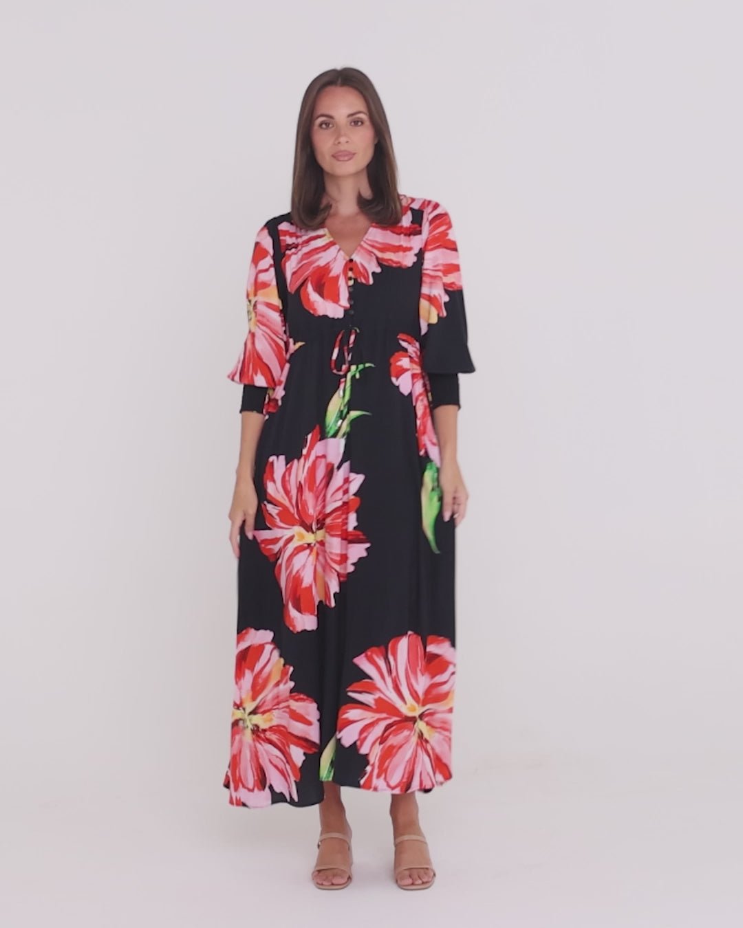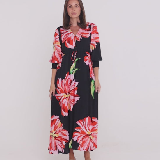 Bold, feminine and effortlessly flattering, the Ann Maxi Dress is designed to bring colour and confidence to your everyday wardrobe. Set against a classic black base, the oversized red hibiscus blooms create beautiful movement and visual impact, while the soft rayon weave drapes gently through the body. The V-neckline and button detail add interest through the front, and the adjustable waist tie allows you to create shape without feeling restricted. Easy to wear and endlessly versatile, this is a maxi dress you can dress up with heels for dinner or keep relaxed with sandals for daytime outings. A stunning addition to women’s fashion Australia, designed for comfort and modern style.