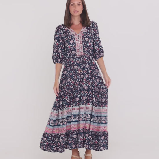 The Annetta Dress in Raspberry Navy Jacobean brings a timeless elegance to everyday dressing, blending intricate florals with beautifully placed contrast borders. Crafted from softly woven rayon, this style has a fluid drape that moves effortlessly with the body while remaining comfortable for all-day wear. The V neckline is finished with a contrast printed trim, drawing the eye upward and adding a refined detail through the bodice. An elasticised waist with an adjustable drawstring creates gentle shape without feeling restrictive, while the tiered maxi skirt adds graceful movement. Finished with practical side pockets and easy three-quarter sleeves, this is a versatile piece you’ll reach for across seasons, from casual lunches to relaxed evening outings.