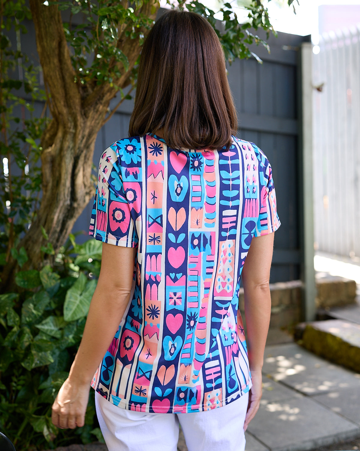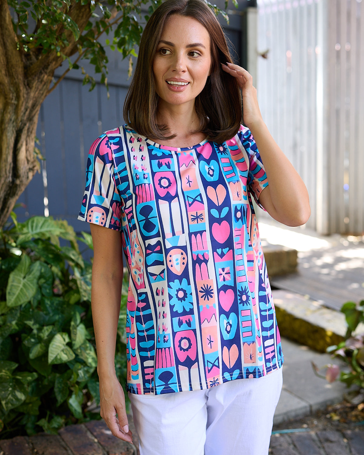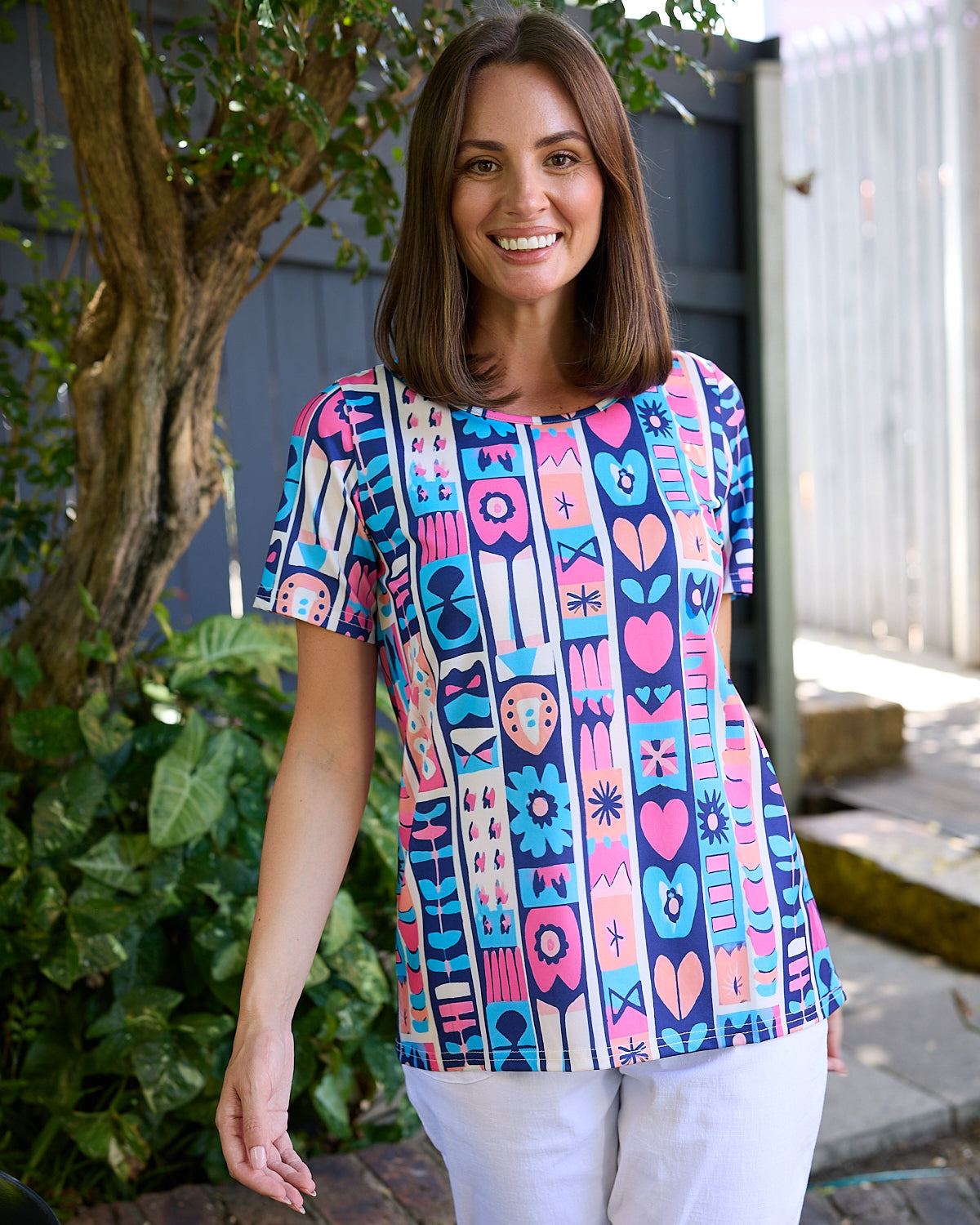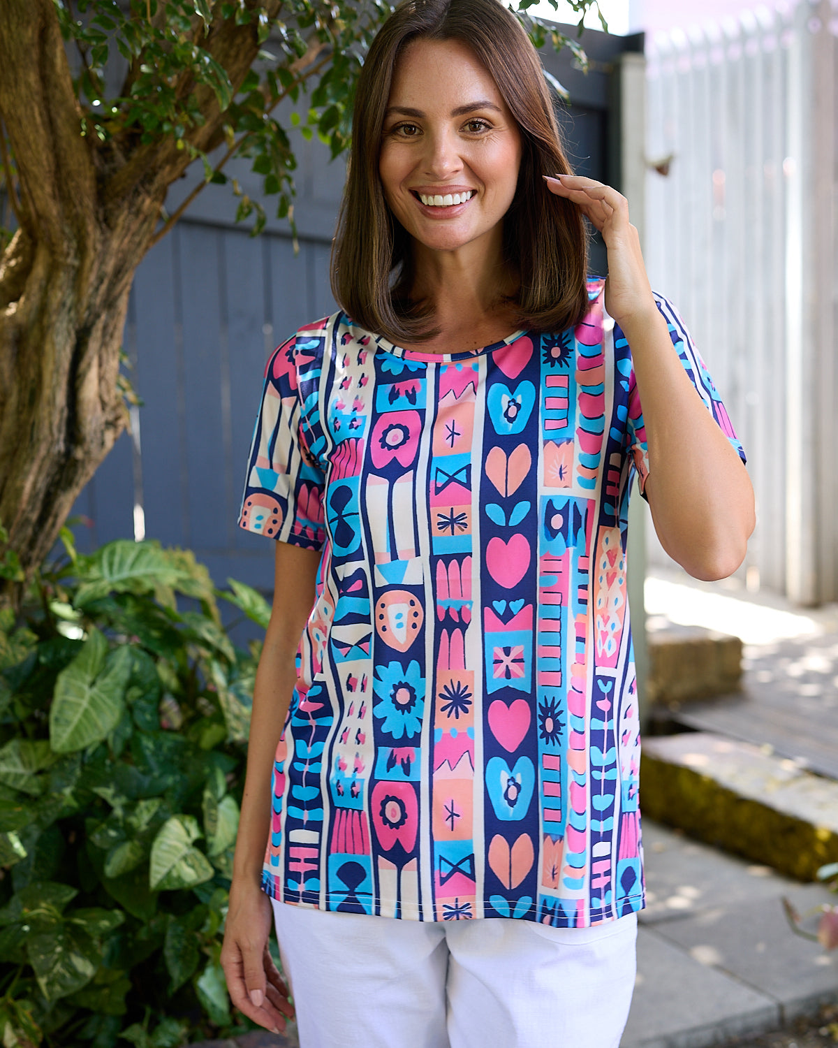 Bright and upbeat, the Aubrey Top in Taki Tango brings instant sunshine to everyday dressing. The artwork blends coral, aqua and violet in joyful geometric motifs, while the easy tee shape makes outfit building a breeze. A scoop neckline and short sleeves skim comfortably without clinging, and the relaxed silhouette partners perfectly with denim, white pants or breezy linen shorts. Cut from soft, easy-care cotton-blend jersey with a touch of stretch, it travels well and feels lovely from brunch to beach walks.
