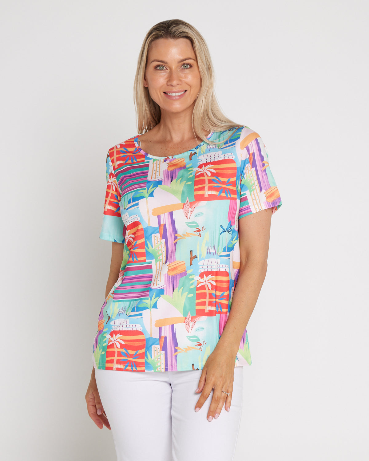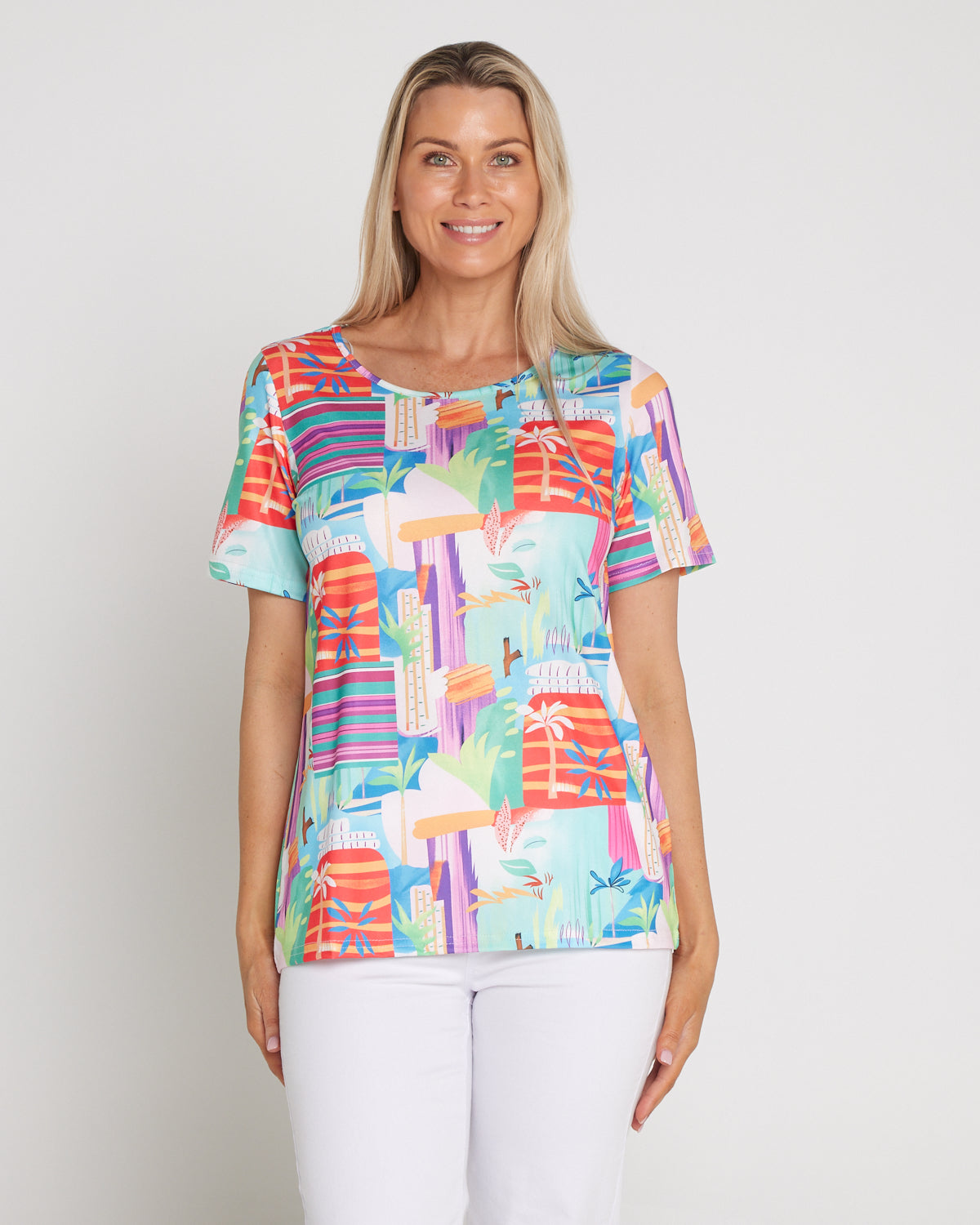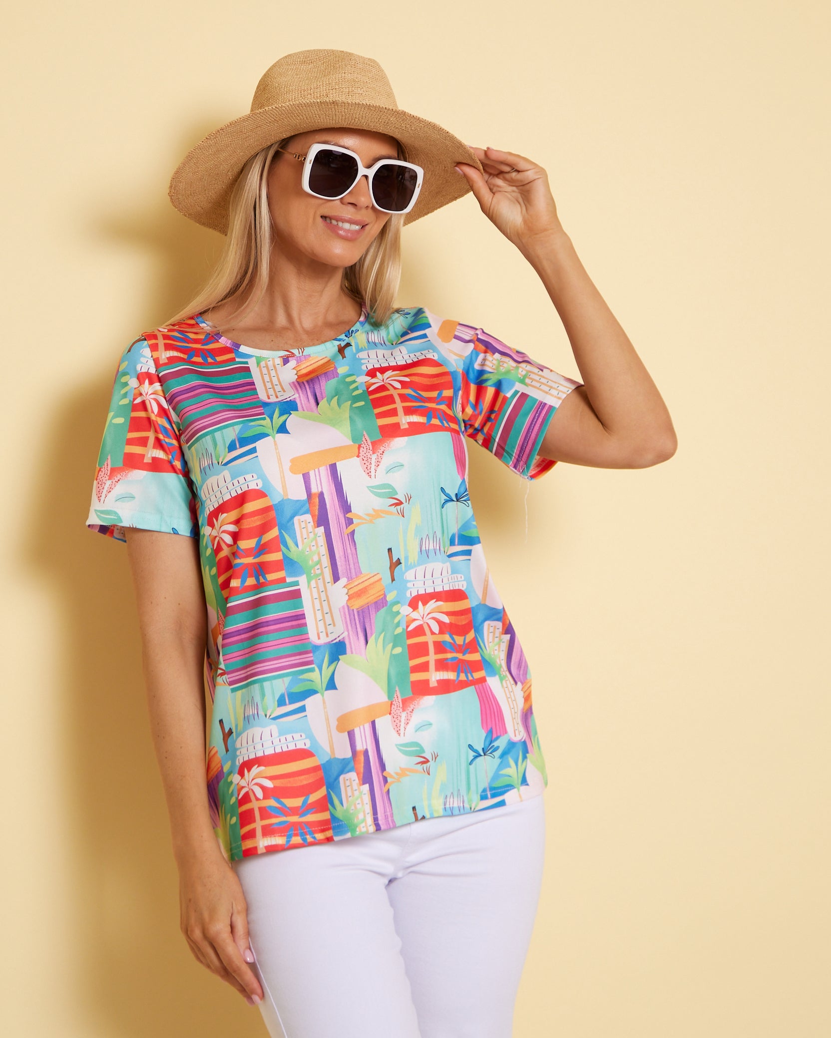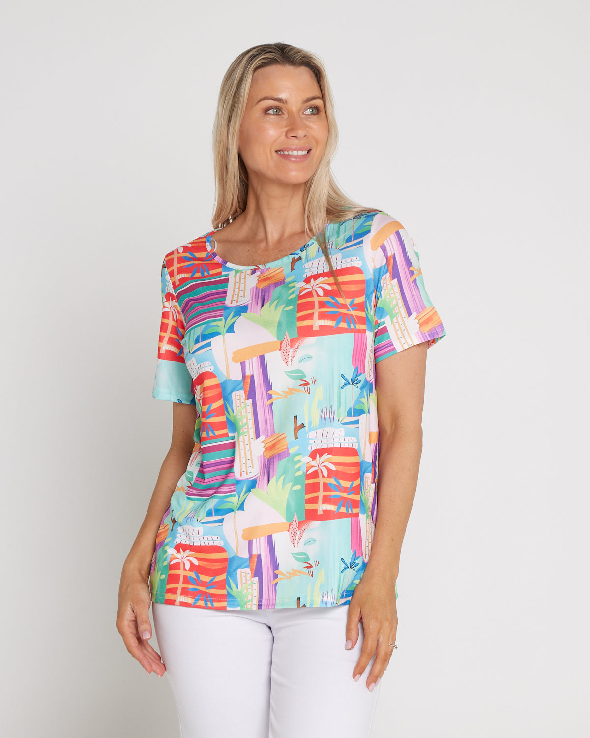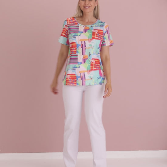 The Aubrey Top in Tropicana Vista brings instant sunshine to your everyday wardrobe. A lively artwork of coral, aqua and violet energises this easy tee, while the classic cut makes it a breeze to style. The scoop neckline and short sleeves skim comfortably without clinging, with a relaxed silhouette that works with denim, white pants or linen shorts. Made from soft, easy-care cotton-blend jersey with light stretch, it’s a cheerful choice for weekends, travel and casual catch-ups—just add sandals and a smile.