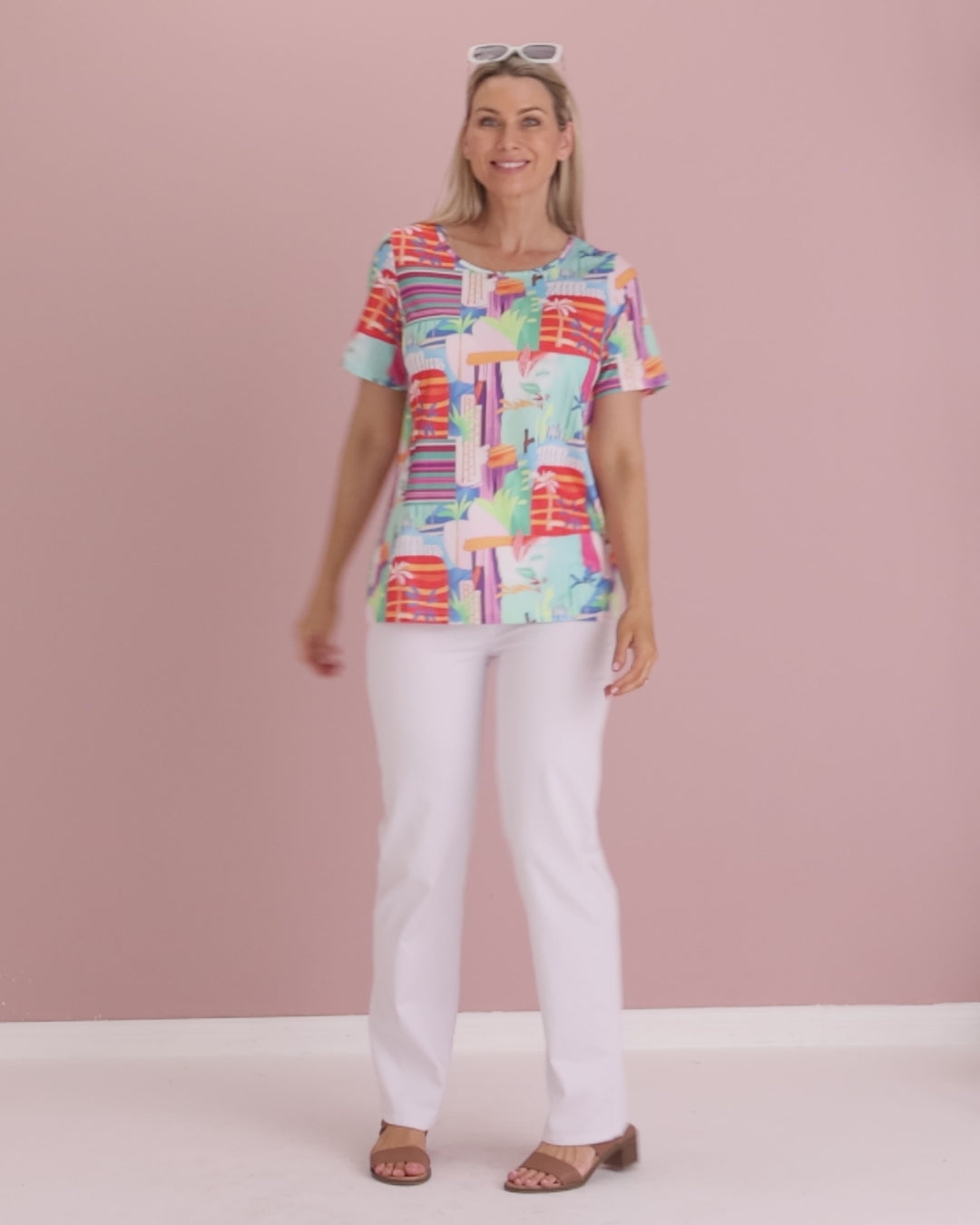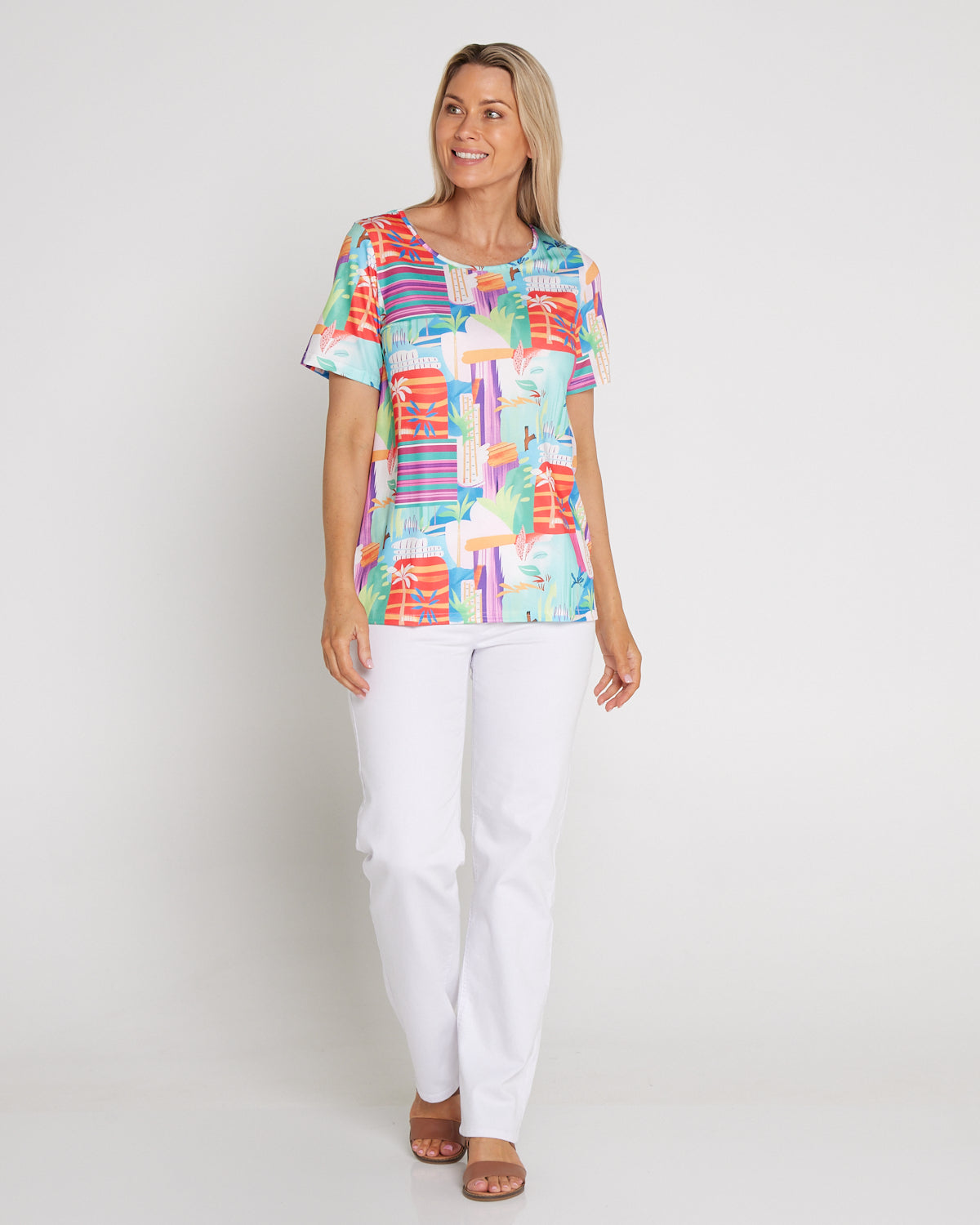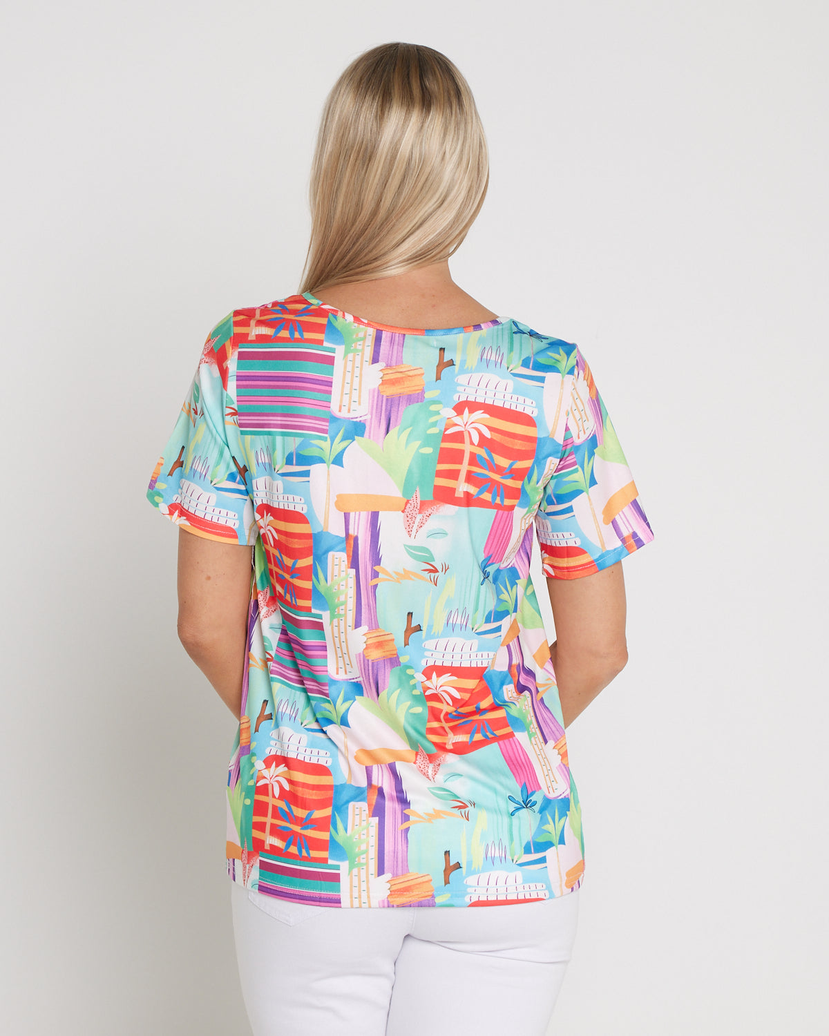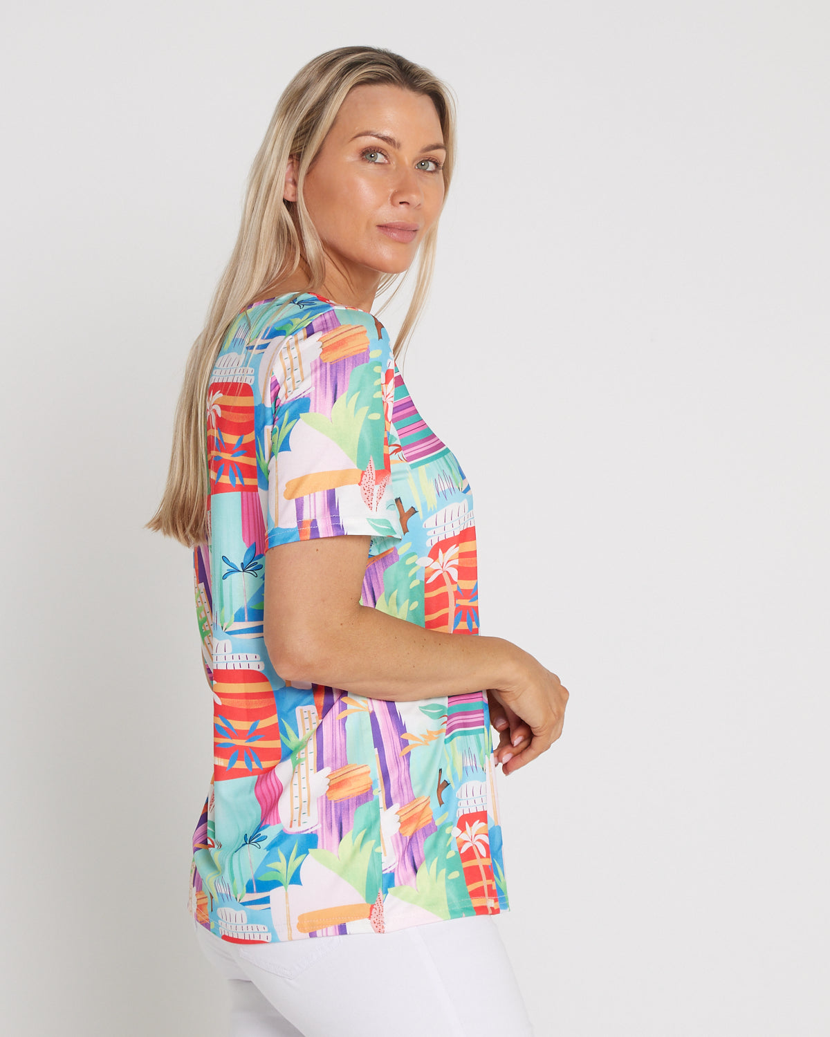 The Aubrey Top in Tropicana Vista brings instant sunshine to your everyday wardrobe. A lively artwork of coral, aqua and violet energises this easy tee, while the classic cut makes it a breeze to style. The scoop neckline and short sleeves skim comfortably without clinging, with a relaxed silhouette that works with denim, white pants or linen shorts. Made from soft, easy-care cotton-blend jersey with light stretch, it’s a cheerful choice for weekends, travel and casual catch-ups—just add sandals and a smile.