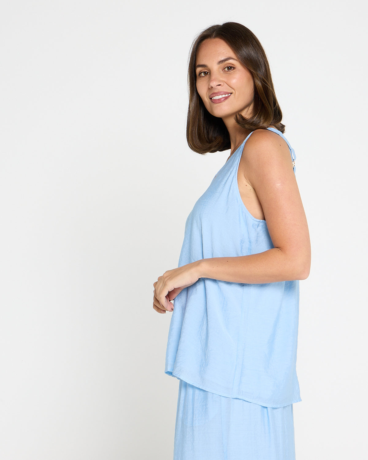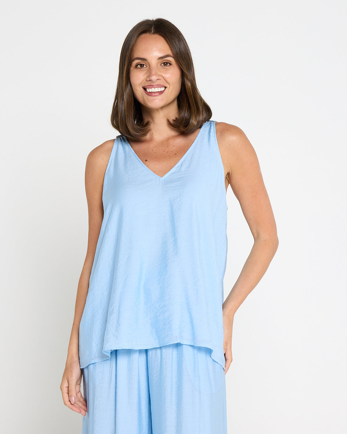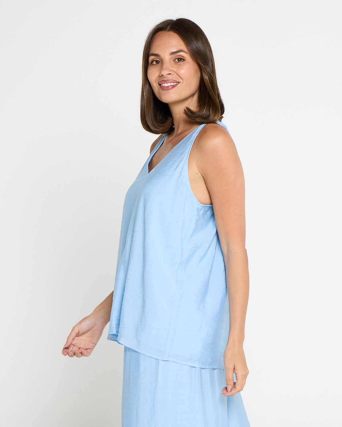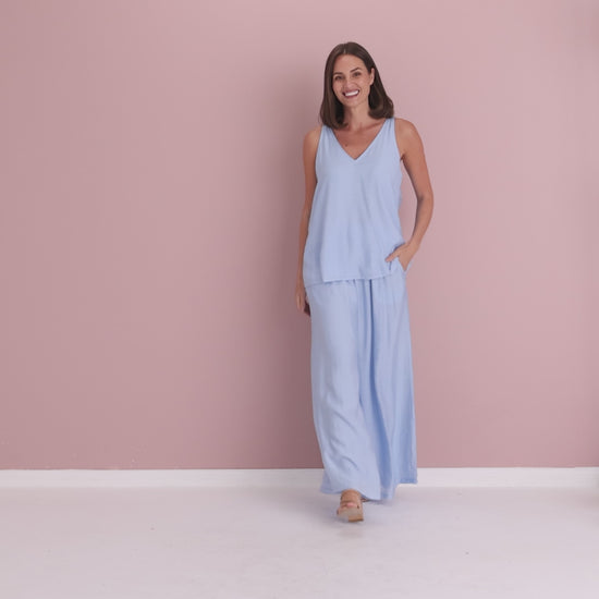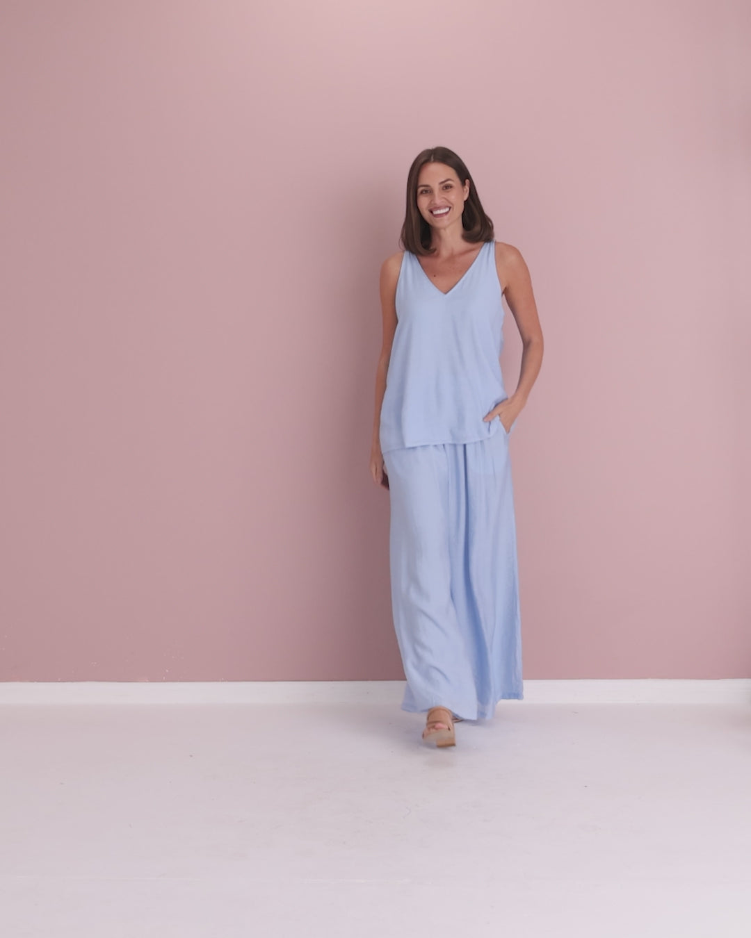 Bring a soft glow to sunny days with the Baja Tank in Safira. This modern staple skims beautifully with a gentle swing shape that never clings, while the V neckline and adjustable straps frame the shoulders with ease. The subtly lustrous weave gives a hint of polish, and the smooth full lining keeps it opaque and comfortable. Pair with the matching pants for an effortless set, or team with white denim and slides for relaxed lunches and holiday strolls.