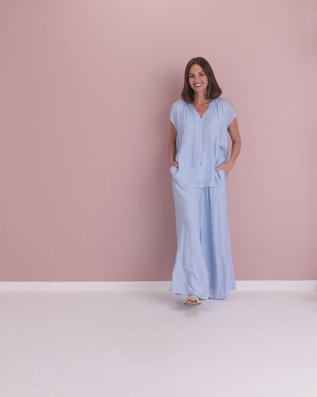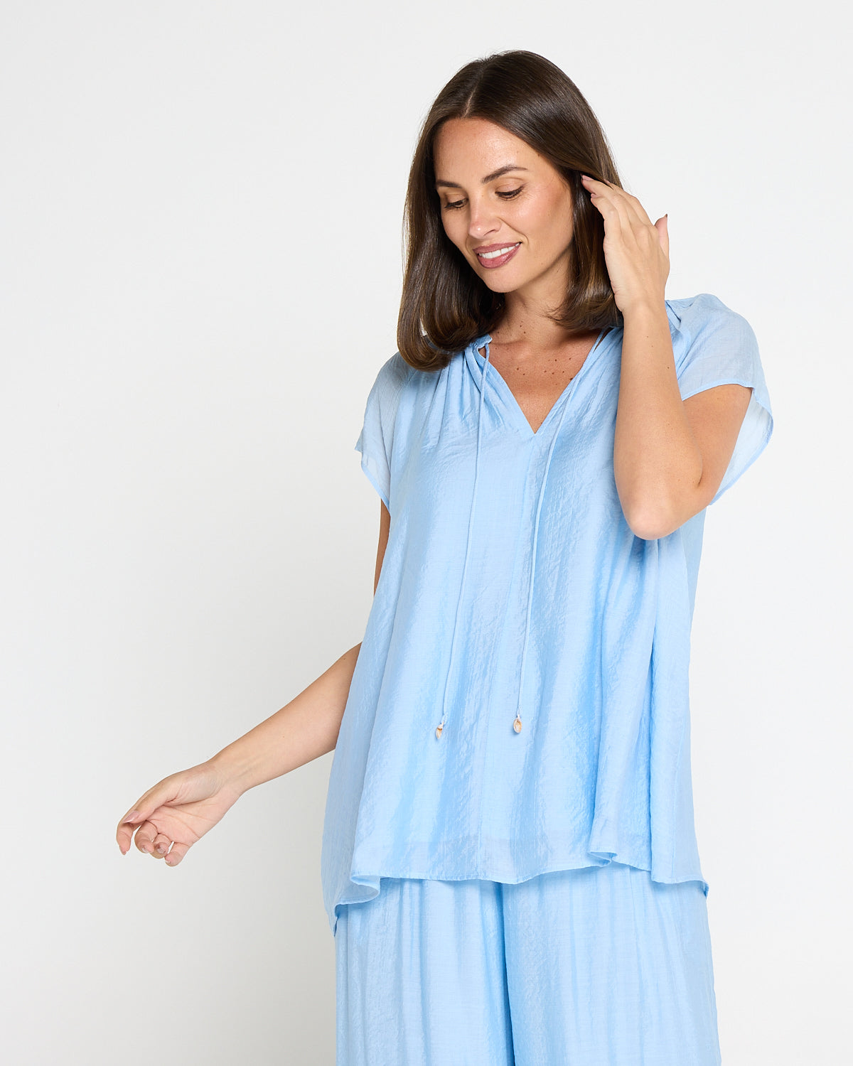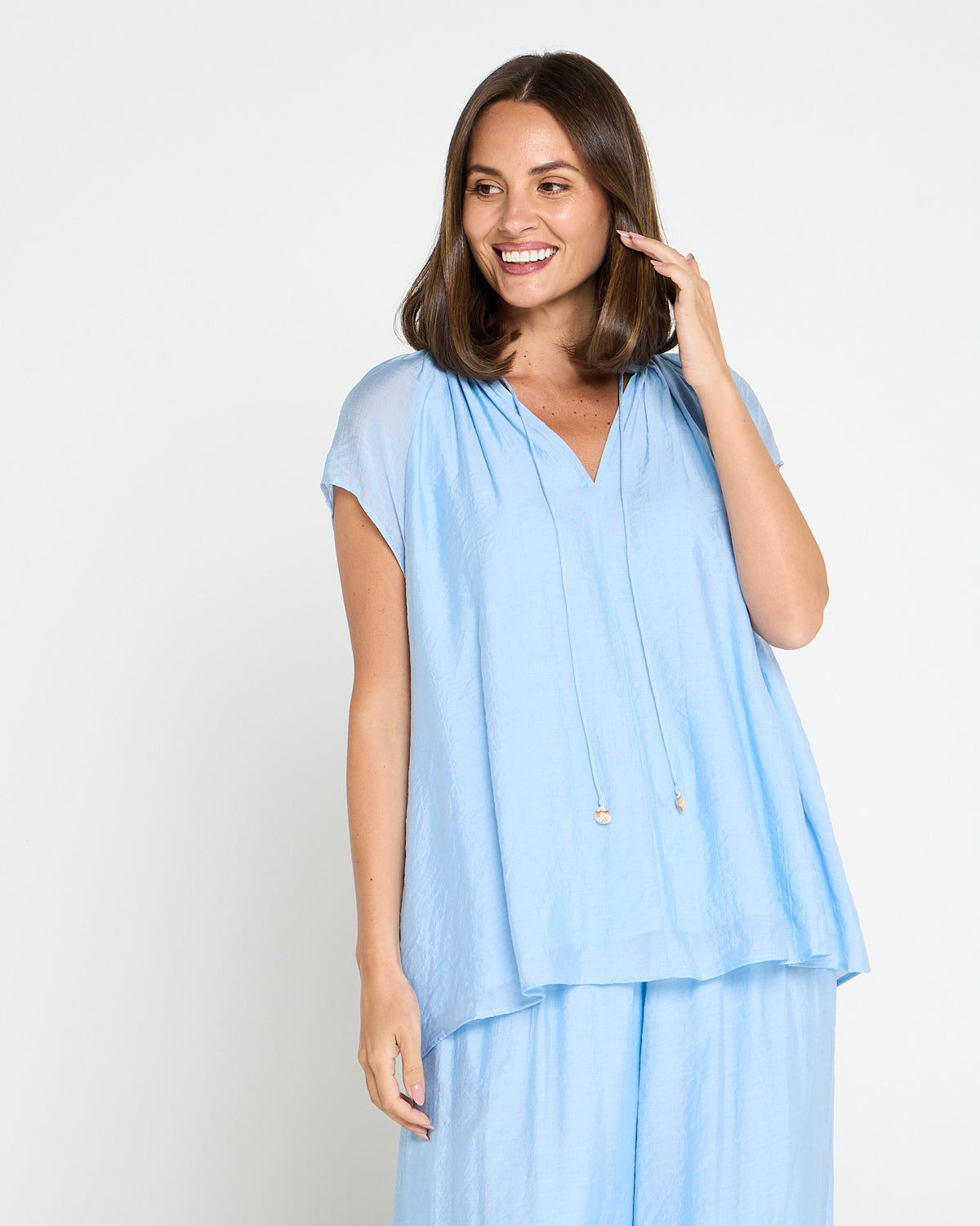 A breezy warm-weather staple with just a hint of shimmer, the Baja Top in Safira brings relaxed polish to everyday dressing. The soft V neckline features delicate ties tipped with shell-style charms, while gentle gathers create a floaty drape that skims without clinging. Light flutter sleeves offer arm coverage without weight, and the swing hem moves beautifully with every step. Fully lined through the body for confidence, it pairs perfectly with the matching pants or white denim for effortless summer style.