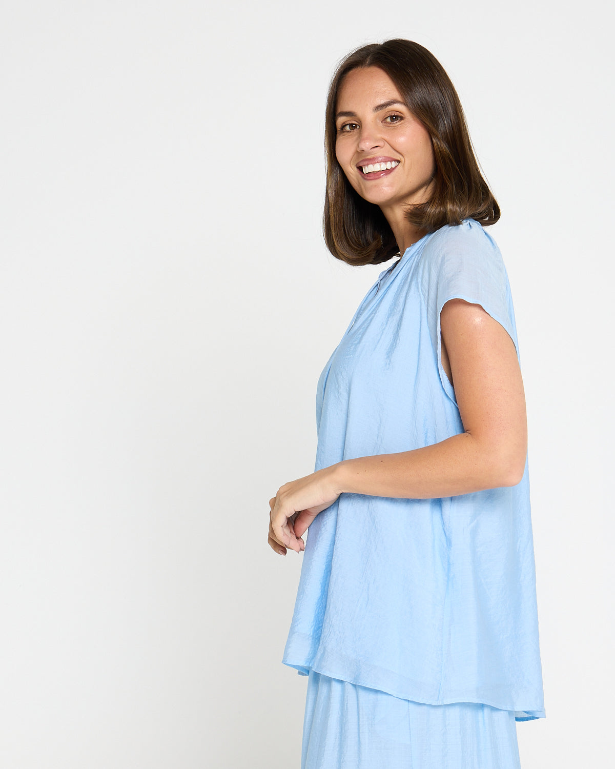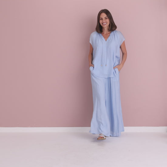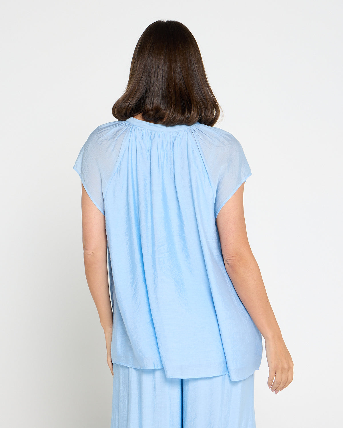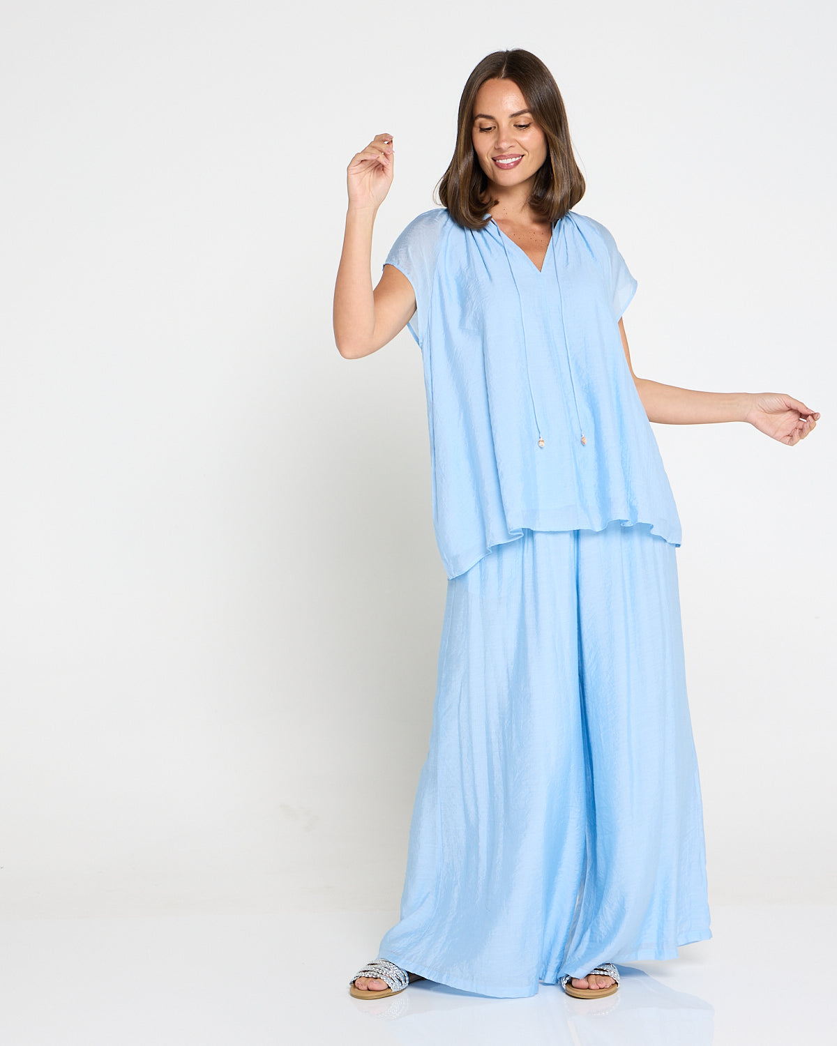 A breezy warm-weather staple with just a hint of shimmer, the Baja Top in Safira brings relaxed polish to everyday dressing. The soft V neckline features delicate ties tipped with shell-style charms, while gentle gathers create a floaty drape that skims without clinging. Light flutter sleeves offer arm coverage without weight, and the swing hem moves beautifully with every step. Fully lined through the body for confidence, it pairs perfectly with the matching pants or white denim for effortless summer style.