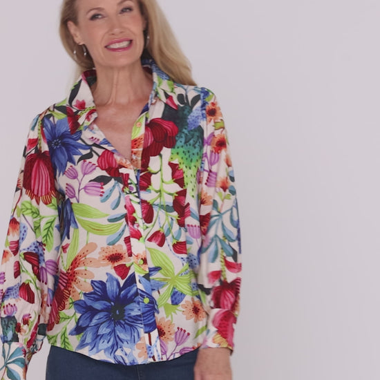 The Bellevue Blouse in Botanical Bliss is a statement piece that brings colour, artistry and polish to everyday dressing. Featuring a vibrant floral print with layered blues, greens, coral and soft neutrals on an ivory base, this design feels expressive yet wearable. Crafted from a textured woven viscose blend with a subtle lustre, it offers a beautiful drape without stretch, creating a refined silhouette that still feels comfortable. Classic shirt styling is balanced with soft shaping through the body, making it easy to wear loose or half-tucked. Designed by Jolie Saule, this blouse pairs effortlessly with denim for relaxed days or styled with tailored pants for lunch dates, work or weekend events.