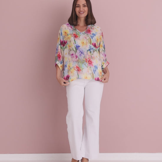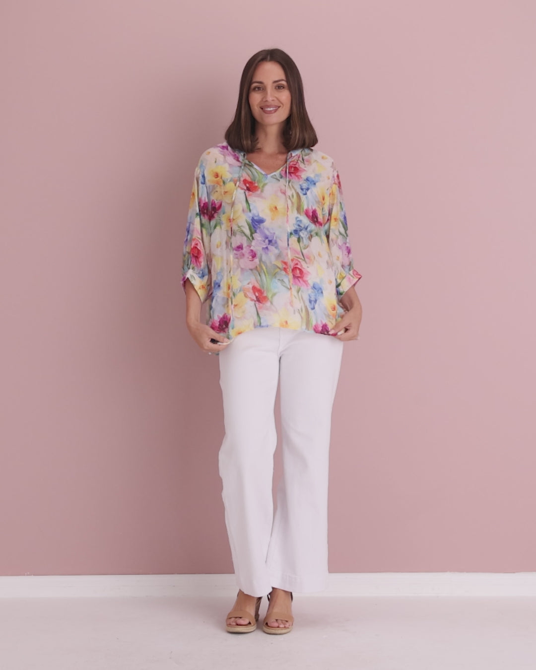 Soft, floaty and beautifully feminine, the Bellissimo Blouse blooms with watercolour florals in sunny daffodil tones. Cut from a lightweight faux-silk chiffon, it drapes effortlessly and feels cool and airy on warm days. A relaxed fit skims the body without clinging, while the V neckline with slim ties lets you choose open and breezy or softly tied for coverage. Gentle volume through the 3/4 sleeves balances the silhouette, and subtle front seams give a lengthening effect. Style with white jeans or linen pants for brunch, then switch to slim trousers and a wedge for evening.