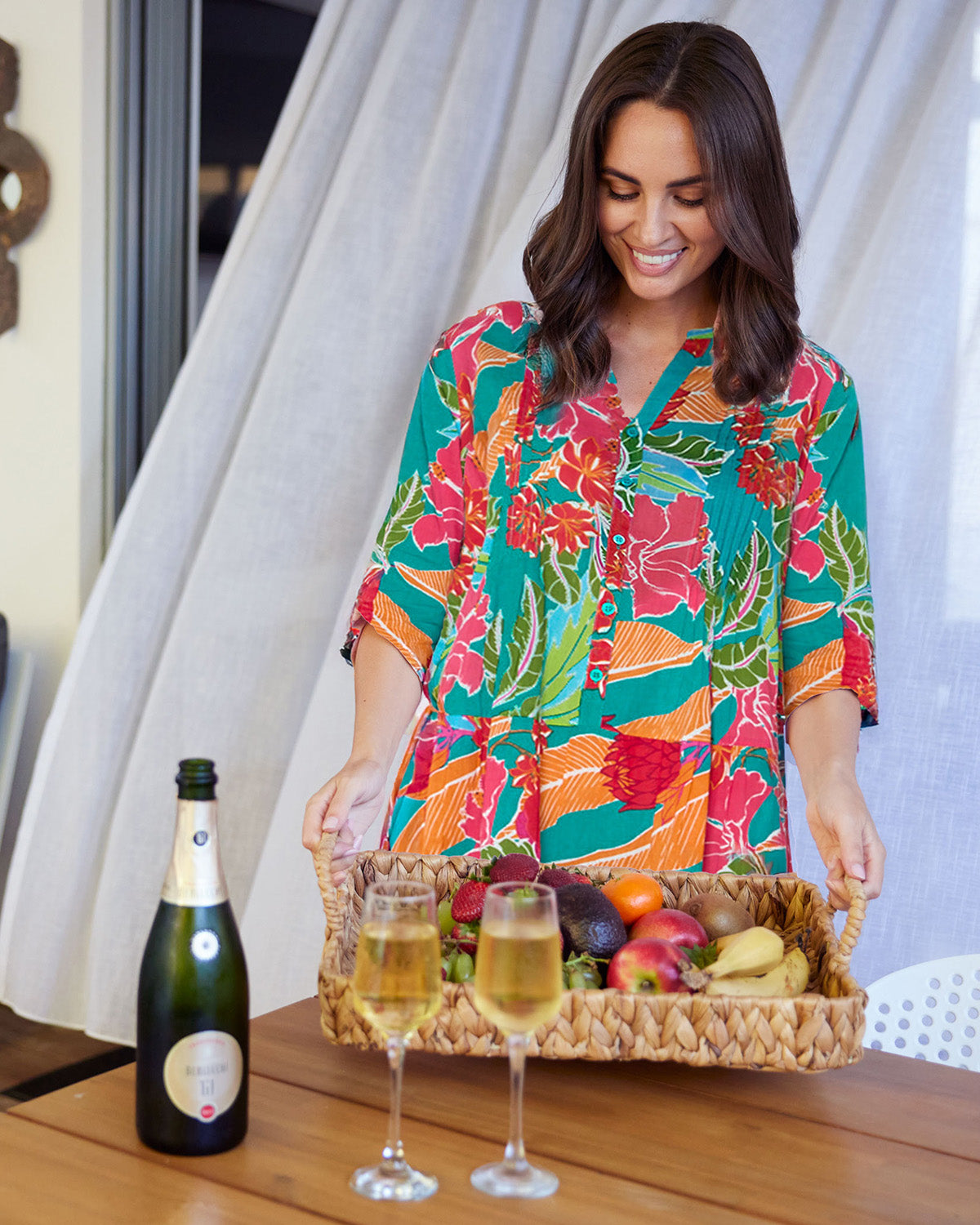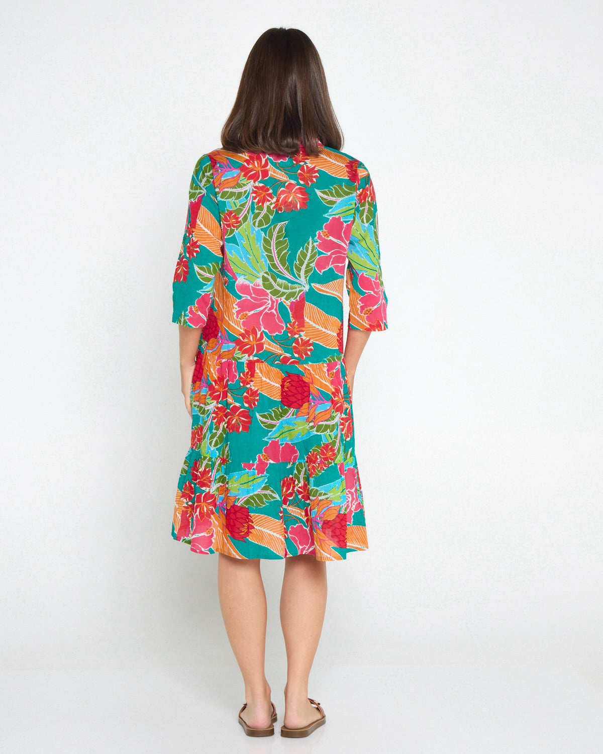 Discover the epitome of summer elegance with the Beth Dress, from Orientique's One Summer collection. The gorgeous teal, green, orange and red design featuring Waratahs and Proteas , making it the perfect Christmas dress. The open Nehru-style collar and three quarter sleeves lend a touch of sophistication. Buttons adorn the bust, adding a refined detail. With a knee-length cut, the lightweight dress captures the essence of summer ease. Crafted from a pure cotton non-stretch crinkle weave, it offers comfort and an enchanting silhouette. Embrace the beauty of the season with this versatile and captivating piece that effortlessly blends style and comfort.