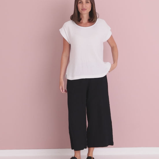Breezy comfort meets easy polish in these black cheesecloth pants. Crafted from airy pure cotton with a soft crinkle texture, they drape lightly while providing opaque coverage—ideal for everyday wear. The pull-on elastic waistband sits smoothly and feels comfy all day, and practical pockets keep essentials close. A cropped wide leg creates a relaxed, modern silhouette that works with tanks, tees or an open shirt. Perfect for warm days, weekends away and effortless travel outfits.