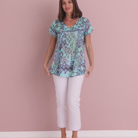 I recently bought this Summer Ikat Carmody top and I love it! It is cool, comfortable and easy to wear. It fits well around the neck, shoulders and arms and the pleating in the front allows plenty of airflow for our hot humid summers here in Brisbane. . It washes well.