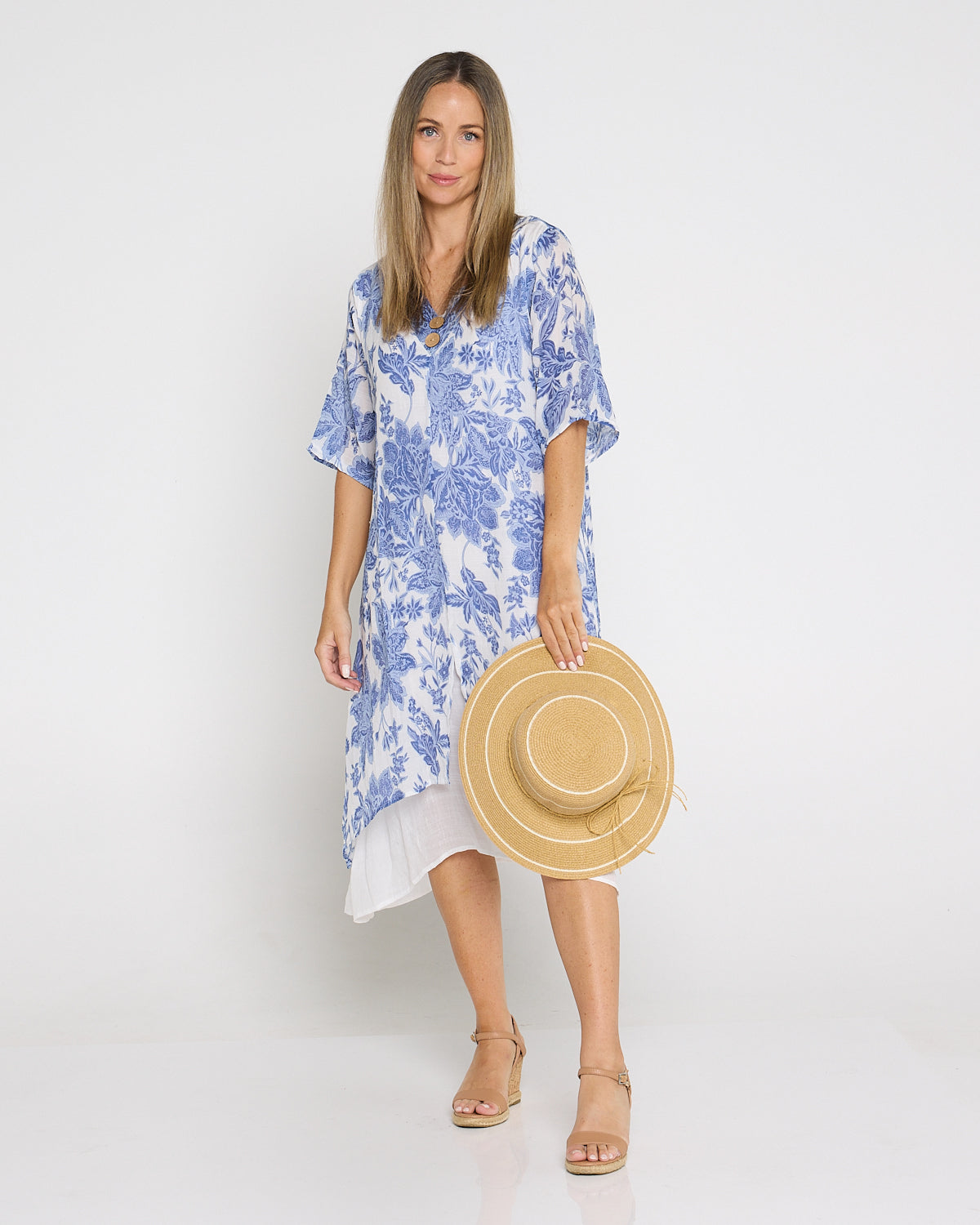 The Catalina Dress in Blue Jacobean brings soft, floaty elegance to warm-weather days. The layered design creates beautiful movement, with the lightweight crinkle-finish overlay falling gently over a white underlay for added coverage and depth. The blue floral motif adds a refreshing coastal feel, while the relaxed silhouette drapes comfortably without clinging – perfect for effortless days out, holidays, long lunches or casual summer occasions. The V-neckline and wooden button detail offer a natural touch, and the elbow-length sleeves provide easy, breathable arm coverage. Style with wedges, flats or sandals for a feminine look that works from day to dinner.
