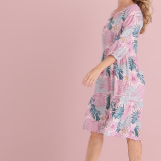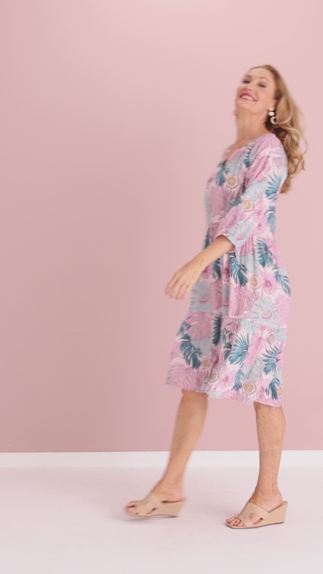 Fresh, feminine and effortless to wear, the Cecilie Soft Tiered Dress in Pink Tropicana is made for warm, sunny days when comfort and style go hand in hand. Crafted from a soft cotton-rich seersucker with a gentle crinkle texture, this dress feels light against the skin while offering an easy, flattering drape. The Pink Tropicana print features layered tropical foliage in soft pinks, muted greens and subtle teal tones, creating a relaxed yet polished summer look. A softly shaped neckline, elasticated sleeves and tiered skirt add movement without clinging, making this an ideal option for everyday wear, weekends away, casual lunches or relaxed events. Style with sandals for daytime ease or add wedges for a slightly elevated finish.