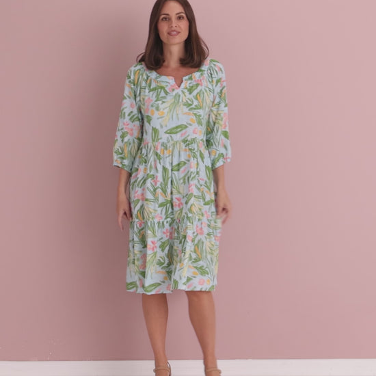 The size chart says bust for size 20 is 124-130cms. I disagree. Laid flat from armpit to armpit on mine is 60cms = 120cms. I hand washed inside out in cold water with mild detergent, did not soak or wring out, hung on a hanger to drip dry in shade & it did not shrink. I give a cool light iron and it is ready to go. I think you could probably get away without an iron but I prefer wearing after a light iron to relax the fabric and smooth out the wrinkles, albeit not many. The fabric is so lovely, light & cool to wear. The other day when I wore it, the weather was warm and humid (not Darwin or QLD humid) but after a very cold winter, & Spring not having really sprung properly yet in ADL/ weird & different weather every day, & not being used to warm weather yet, the dress did not stick to me. The pattern is so pretty. It sits really nicely under my bust, flows over & does not cling to my tummy & does not look frumpy, so I feel more confident. It is very comfortable across my bust & does not feel tight which is often the problem for me. The sleeves are a great length and hide my chubby upper arms that I don't like to reveal. I love the length too. I am tall at about 178cms (I think!!) & it is below my knee which I also feel more confident with. I have issues sometimes with dress waist ties being too low and just not working for me & quite frankly look weird & ridiculous sitting on my hips. My preference is a higher waist tie not too far under the bust to get a good A-line shape. WIth this dress the position of the seam of the bodice where it meets the skirt is good for me - higher than my hips giving a good shape. The skirt with the godets is just lovely giving it some body and floats about nicely. I thought I might be too big for this style but it actually works for me giving me some shape without being restricted with waist ties or elastic or shirring. For me the 20 is fitted but still roomy and so very comfortable. I am learning to try and not buy clothes that are WAY too big for me. I cannot hide the fact that I am big, but if I wear clothes that are not 2 sizes too big it is more flattering!! Tulio are also great to deal with and very responsive to emails and very helpful. Shipping was fast!! I hope this review helps some ladies out there. Thank you for reading :-)