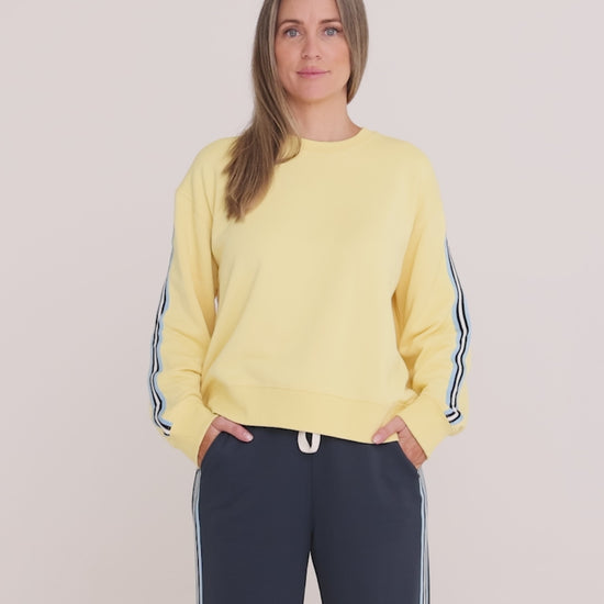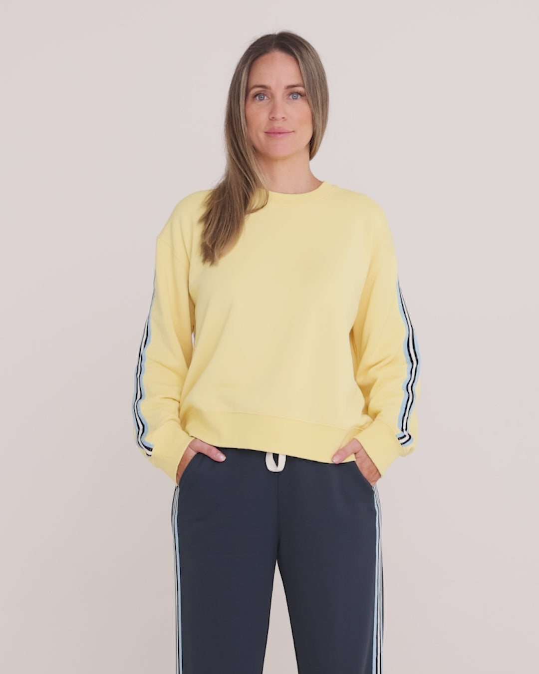 Fresh, fun and effortlessly comfortable, the Celeste Crew in Lemon by Elm Lifestyle is the perfect way to add a pop of colour to your everyday wardrobe. The soft lemon shade brings a light, uplifting feel, while the sporty contrast stripe along the sleeves gives it that signature Elm casual style.