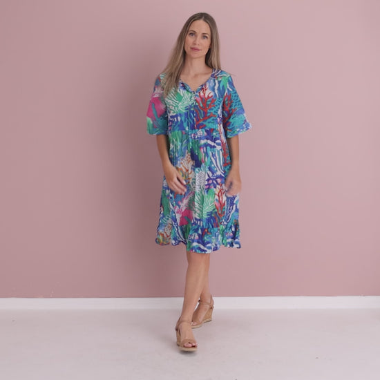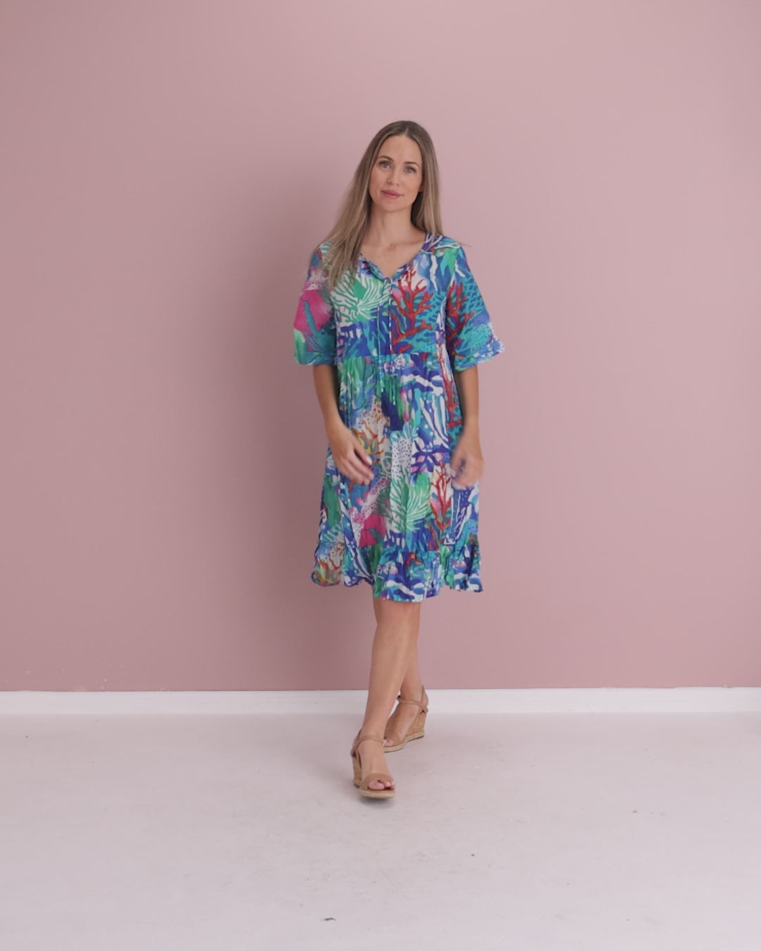 Make every day feel like a holiday in the Charli Cotton Tassel Tie Dress in Coral Reef. The vibrant tropical print mixes ocean blues with sun-kissed reds and limes for a joyful pop of colour. A soft V neckline with playful tassel ties frames the face, while gentle smocking through the waist adds definition without clinging. The tiered skirt moves beautifully as you walk, and practical in-seam pockets keep things easy. Crafted from lightweight crinkle cotton with a no-iron finish, it’s the throw-on dress you’ll reach for, for brunch, sightseeing, cruises and warm-weather getaways. Simply add sandals now or white trainers for relaxed weekends.