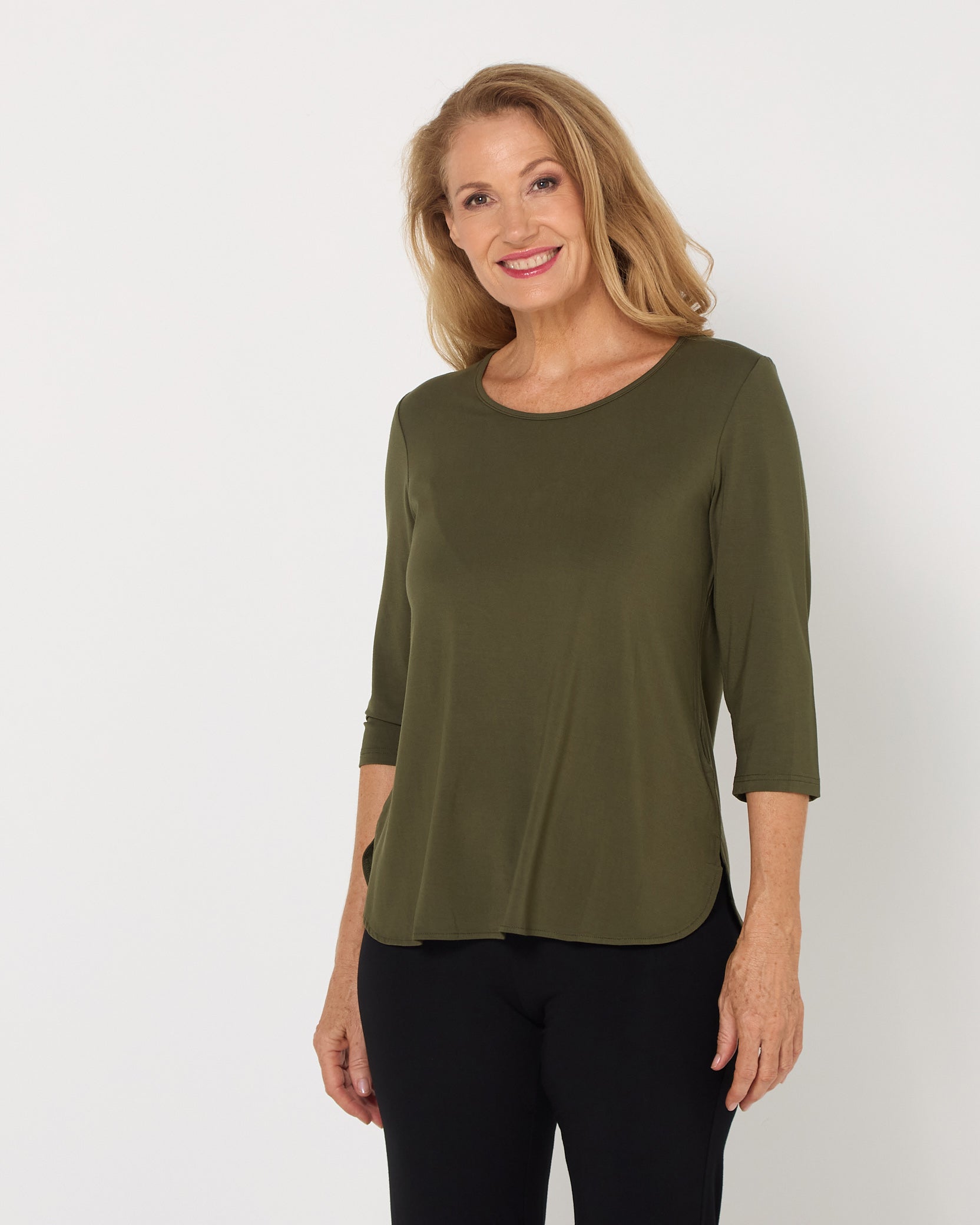 The Charlie Bamboo Top in Khaki is an effortless everyday essential you’ll wear on repeat. Made from ultra-soft bamboo jersey, it offers breathable comfort with natural stretch for easy, all-day wear. The flattering scoop neckline keeps the look clean and feminine, while three-quarter sleeves provide versatile coverage across seasons. A relaxed fit with subtle shaping and a softly scooped hem ensures it drapes beautifully over the hips. Perfect worn loose with pants or layered under jackets and knitwear.