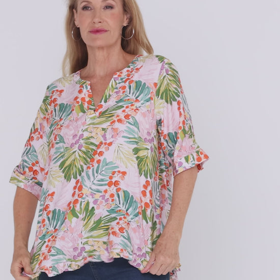 Bring a fresh burst of colour to your everyday wardrobe with the Charlotte Blouse in our vibrant Queen Palm Tropical print. Designed for easy wear and flattering coverage, this style features a relaxed silhouette that skims the body without clinging. The tropical palm motif blends soft pinks, leafy greens and warm citrus tones, giving it a joyful yet wearable feel that works beautifully across seasons. A notch V neckline keeps the look open and flattering, while the softly frilled details add femininity without fuss. Perfect with denim for casual days or styled with linen pants and slides for warm-weather outings, this is an effortless piece you’ll reach for again and again.
