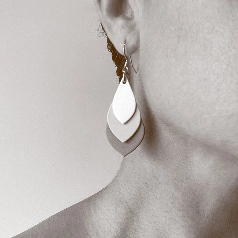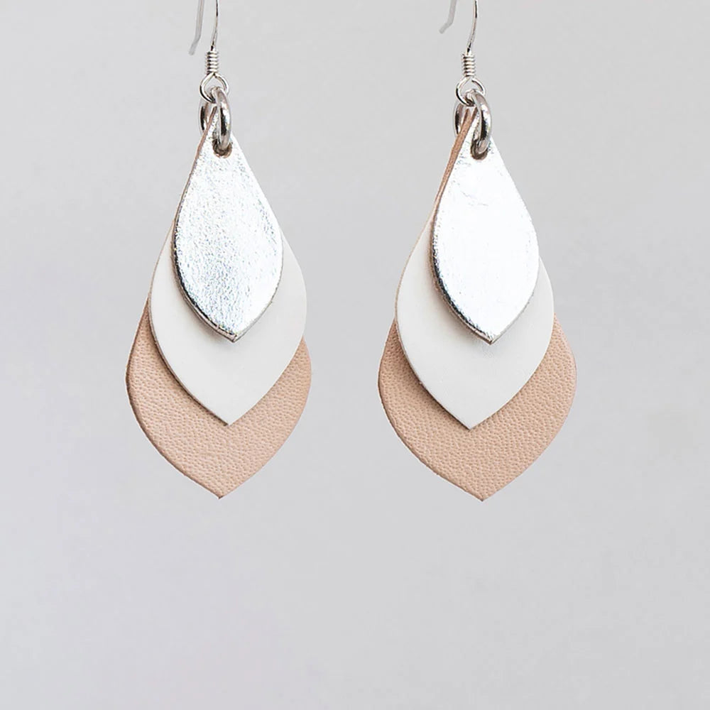Clara Leather Leaf Earrings - Silver/White/Beige