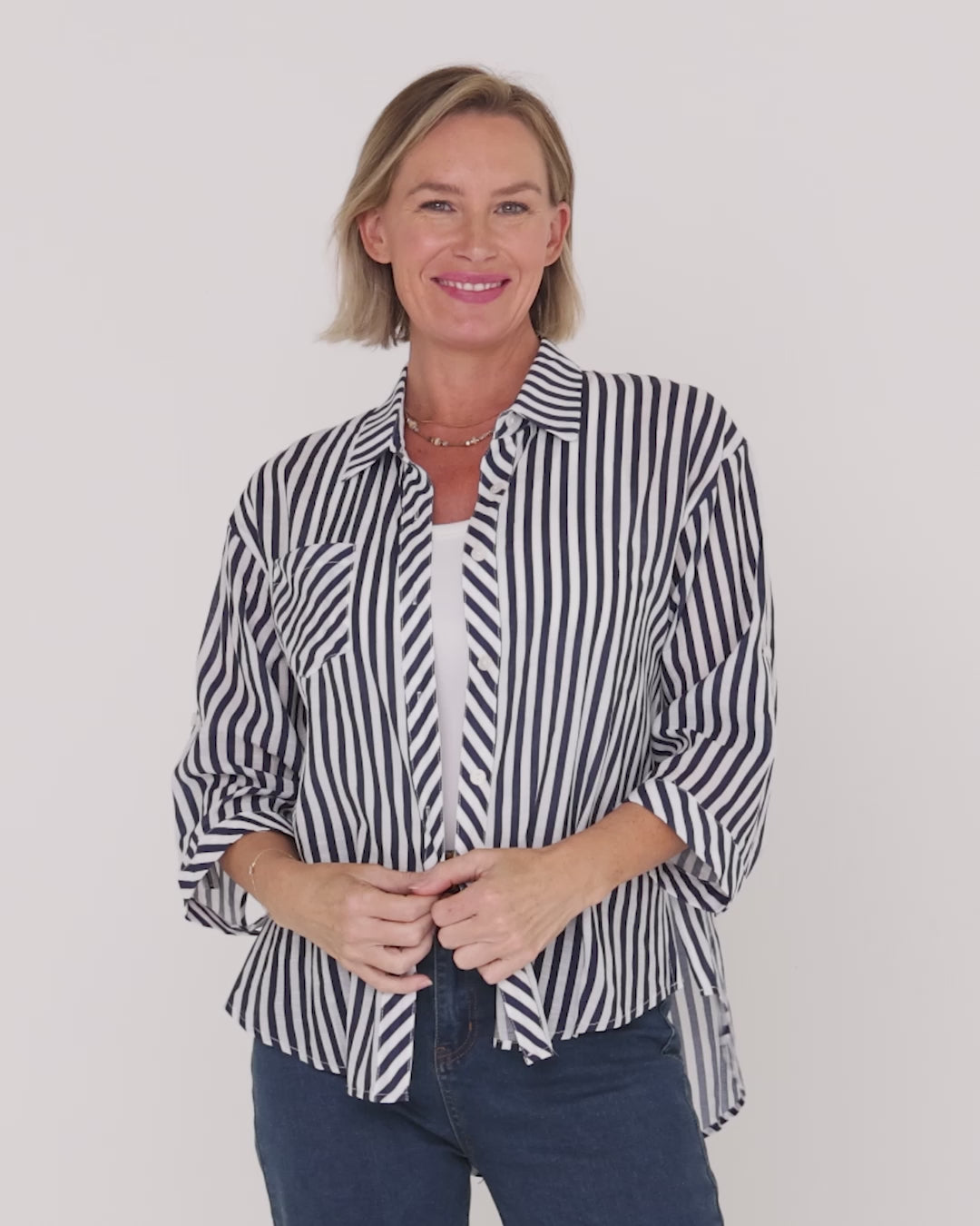 Fresh, classic and effortlessly wearable, the Colana Shirt in Navy Stripe is a timeless piece for everyday women’s clothing in Australia. The crisp vertical stripe creates a flattering, elongating effect, while the relaxed silhouette offers an easy fit that feels comfortable without clinging. It’s the kind of shirt you can throw on with denim for casual days or tuck loosely into tailored pants for a more polished look.