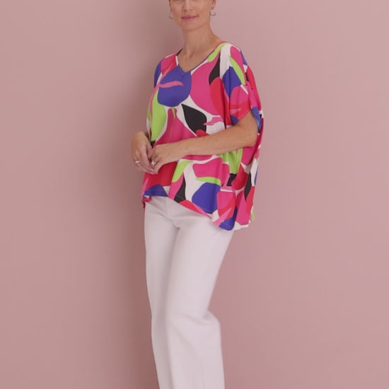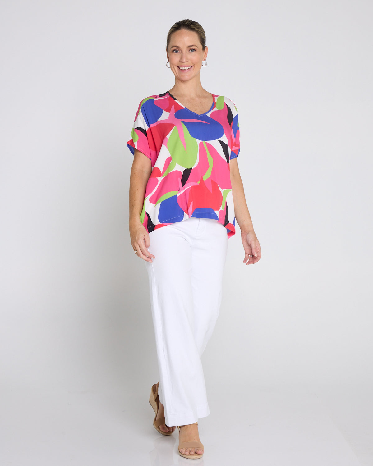 Bright, bold and wonderfully uplifting, the Colour Pop Top in Raspberry Lime brings instant energy to warm-weather outfits. Crafted from a lightweight rayon weave, it offers a soft, airy feel that drapes beautifully without clinging – perfect for staying cool and comfortable through the Australian summer. The vibrant abstract print blends raspberry pink, lime green, cobalt blue and touches of black and white, creating a joyful palette that pairs effortlessly with white pants or denim. A relaxed silhouette and soft V neckline keep the look easy and flattering, while the dolman sleeves add gentle movement. Ideal for lunches, casual gatherings, weekends away or days when you want comfort with a splash of colour.