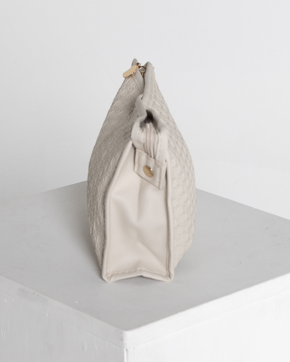 Concord Cosmetic / Travel Case - Magnolia Weave, featuring a chic faux-woven embossed texture across a rubberised outer. The structured silhouette is designed with a flat bottom so it stands upright on your vanity, while the water-resistant materials make it perfectly practical for travel or everyday organisation. A gold-toned zip pull adds a refined finish, and the roomy interior provides easy storage for cosmetics, skincare, or on-the-go essentials.