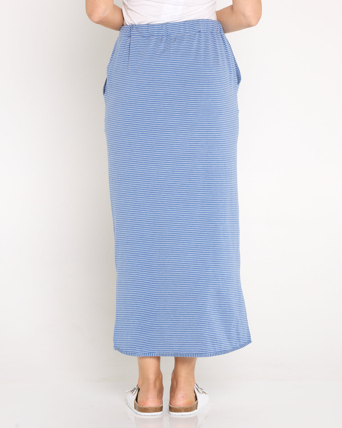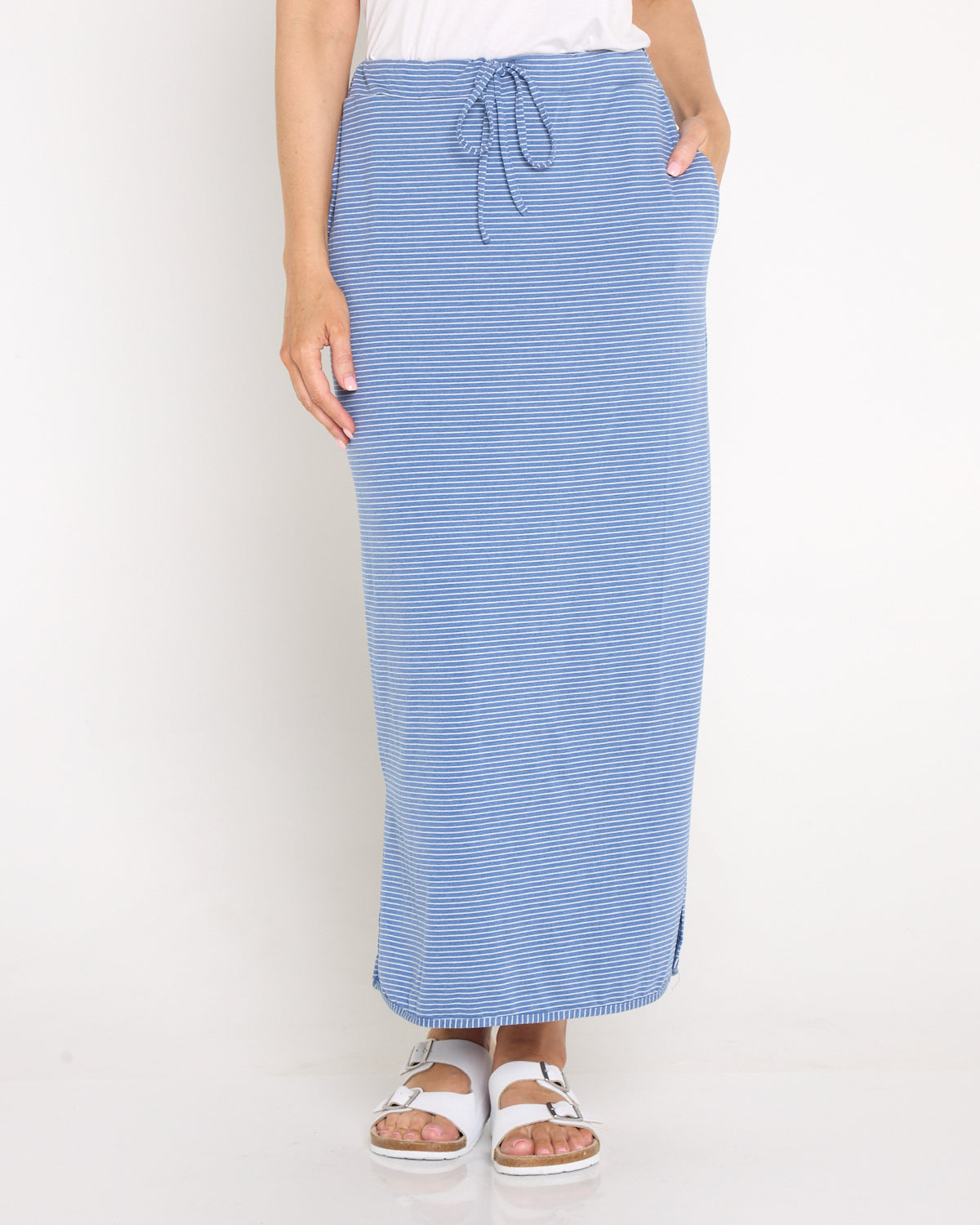 Meet your throw-on, go-anywhere maxi skirt. The Travel Skirt is cut from a soft, easy-care jersey that feels light yet has enough stretch to keep you comfy on long days out. The slim column shape skims without clinging, with an elasticised drawstring waist for a personalised fit and handy side pockets for phone and keys. Classic blue-and-white stripes add a fresh coastal feel. Team with a simple tee and slides for errands, then swap to a denim jacket and sneakers for sightseeing.