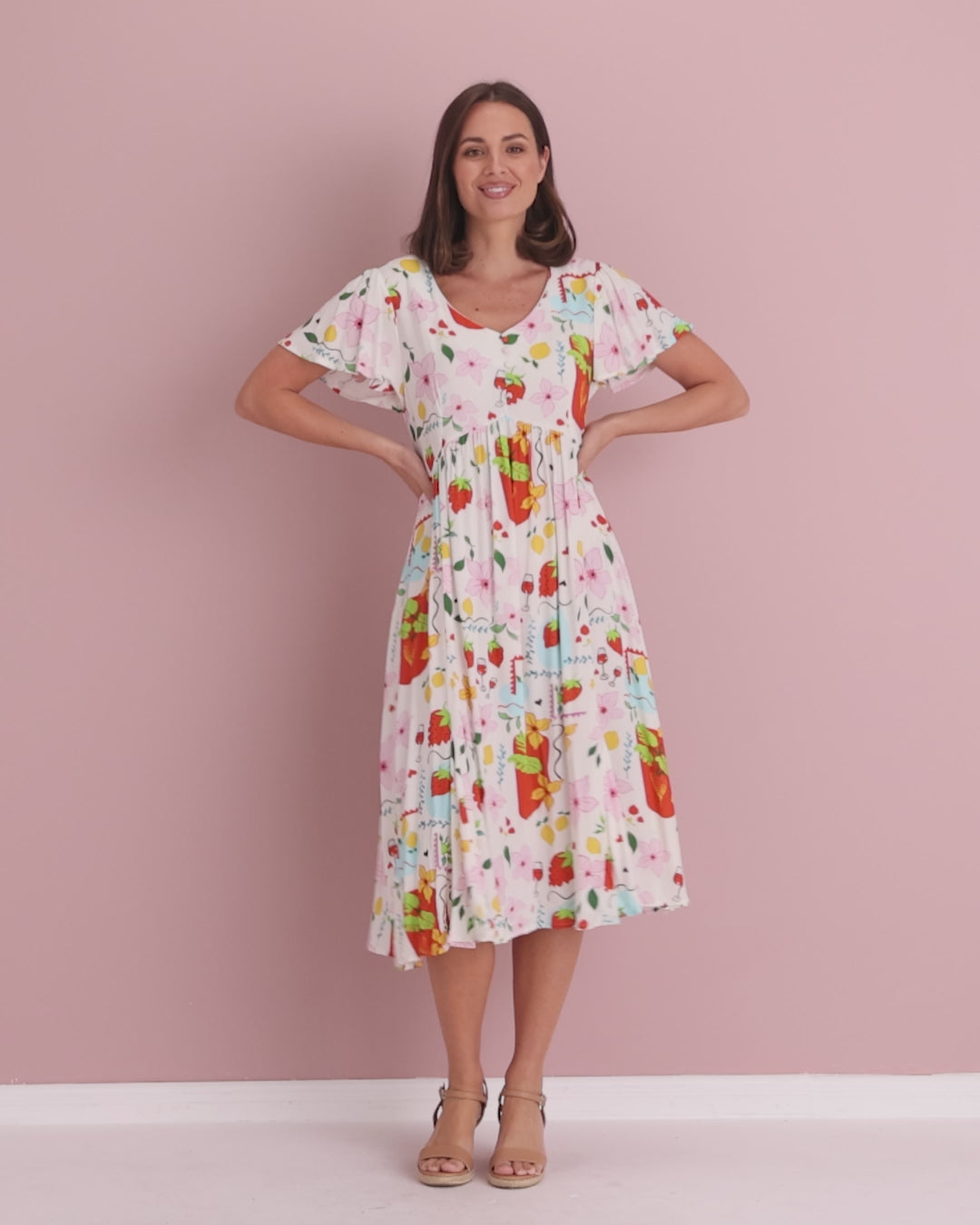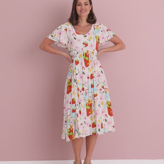 The Brighton returns with a new name and refined fit—meet the Cornwall Dress. Still the easy, feminine silhouette our customers love, now cut truer to size with a touch more room through the bust for all-day comfort. The Summer Fun print splashes cheerful colour across a soft, non-stretch rayon that drapes beautifully without clinging. Flutter sleeves and a gently flared midi skirt bring breezy movement from brunch to holidays and garden parties. Style with wedges and a straw bag, or pare back with slides and a denim jacket.