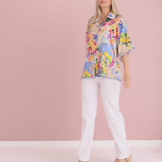 Dreaming of coastal holidays? This vibrant shirt brings the Riviera to your wardrobe with a painterly collage of seaside villages, lemons and florals in uplifting brights. The relaxed, boxy silhouette skims the body without cling, while the scalloped edges with contrast stitching add a pretty, feminine finish. Wear it buttoned with white pants for lunch by the water, or layer it open over a cami and crops for travel days and weekend outings. Soft, lightweight rayon gives beautiful drape and movement.