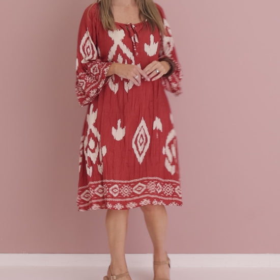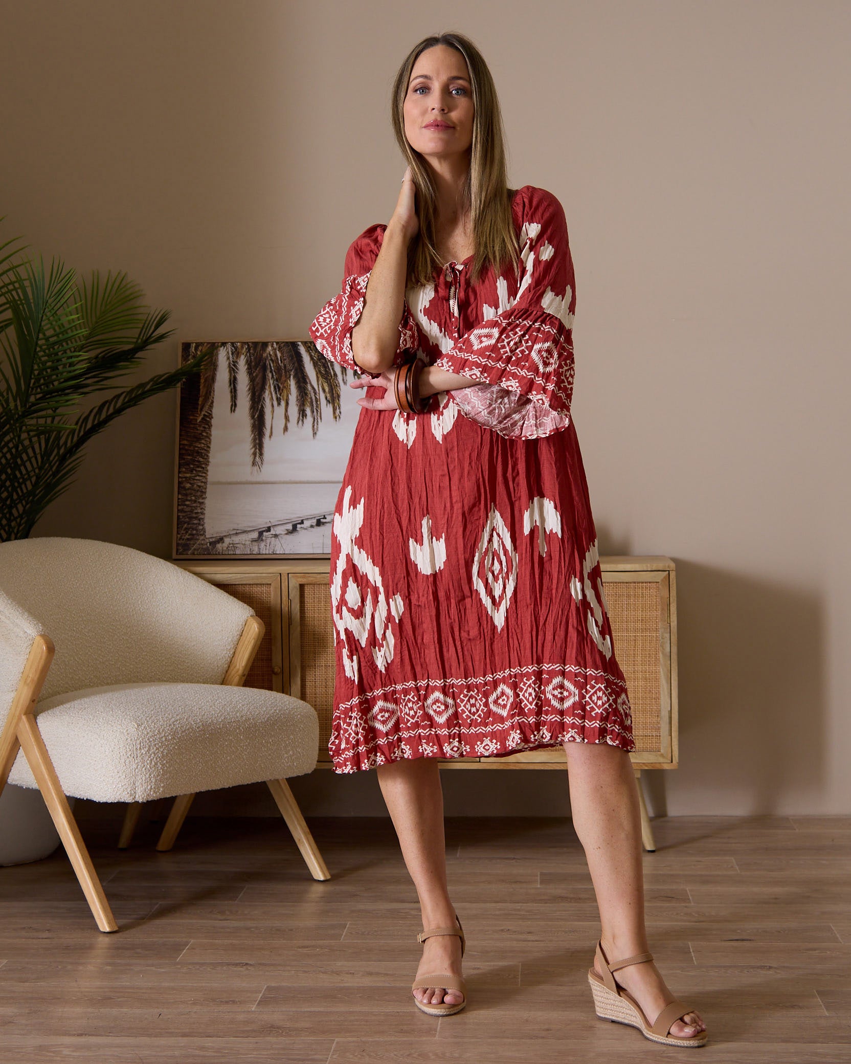 Easy, effortless and full of relaxed charm, the Crinkle Cover Up Dress in Cinnamon Ikat is the kind of throw-on style that instantly feels like summer. The lightweight crinkle weave offers a soft, breezy drape, while the earthy cinnamon base and bold ikat motifs give the dress a warm, global-inspired feel. The tie neckline and billowed sleeves add to its laid-back appeal, and the knee-length cut makes it perfect for holidays, casual lunches or warm weekends at home. Simply pair with sandals or slides and enjoy fuss-free, flattering comfort all season long.