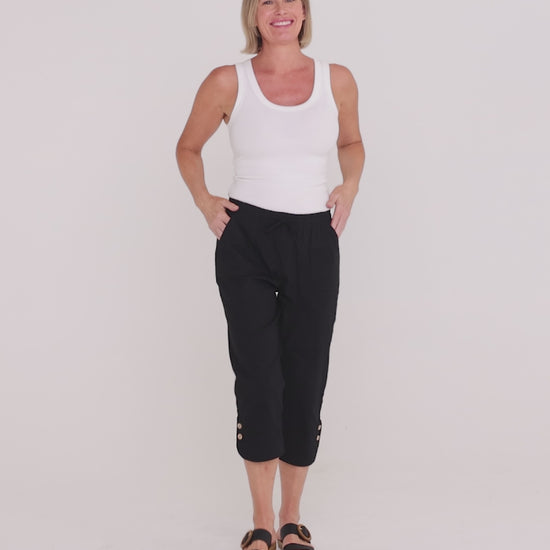 Now in black! Polished and practical, the Danny Capri Pants in are a warm-weather essential. The cropped leg is finished with a neat button detail, adding subtle interest without bulk. Cut in a smooth, easy-care stretch fabric, they offer everyday comfort with a sleek silhouette that pairs perfectly with breezy blouses and relaxed tees. Ideal for work-to-weekend dressing and travel.