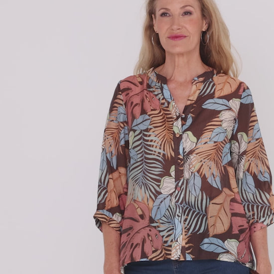 The Delilah Blouse adds a warm, earthy pop to any outfit with its rich palette of chocolate, peach and sky-blue leaves. Cut in a relaxed silhouette that skims rather than clings, it feels feather-light and moves beautifully thanks to the ultra-light woven fabric. A soft mandarin collar and button front keep it neat for work or weekends, while the three-quarter sleeves offer easy coverage year-round. Pair with denim, black pants or white for contrast.