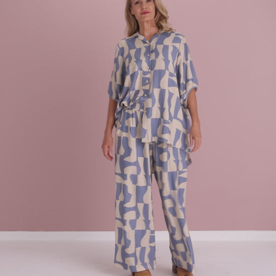 Step out in comfort and style with the Demi Wide Leg Pants by Cotton Village, featuring an abstract print in soft sky blue and sandy beige. The wide leg cut creates a relaxed and flattering silhouette, while the soft cotton blend and elastic waistband with drawstring ensure an easy fit all day long. Perfect on their own or worn as a set with the matching shirt.