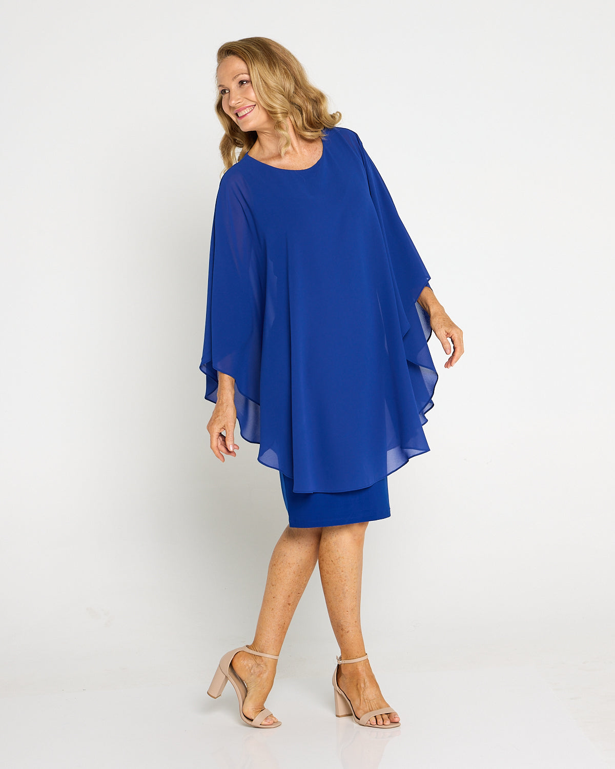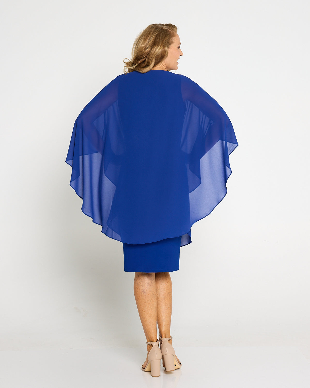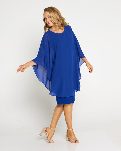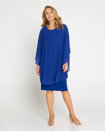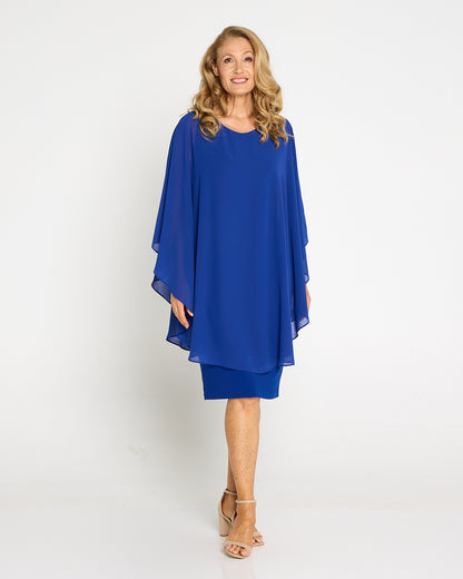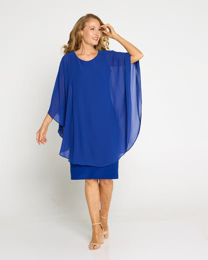 Make an entrance in luminous electric blue. The Diana Dress layers a floaty chiffon overlay over a smooth, stretch jersey underdress for elegance that still feels effortless. The soft drape skims beautifully without clinging, while the cape-style sleeves create graceful movement from every angle. Cut to the knee, it’s a timeless choice for weddings, the races and special dinners. Add metallic heels and a clutch for evening glamour, or pearl earrings and a wrap for a refined daytime look.