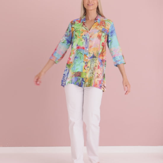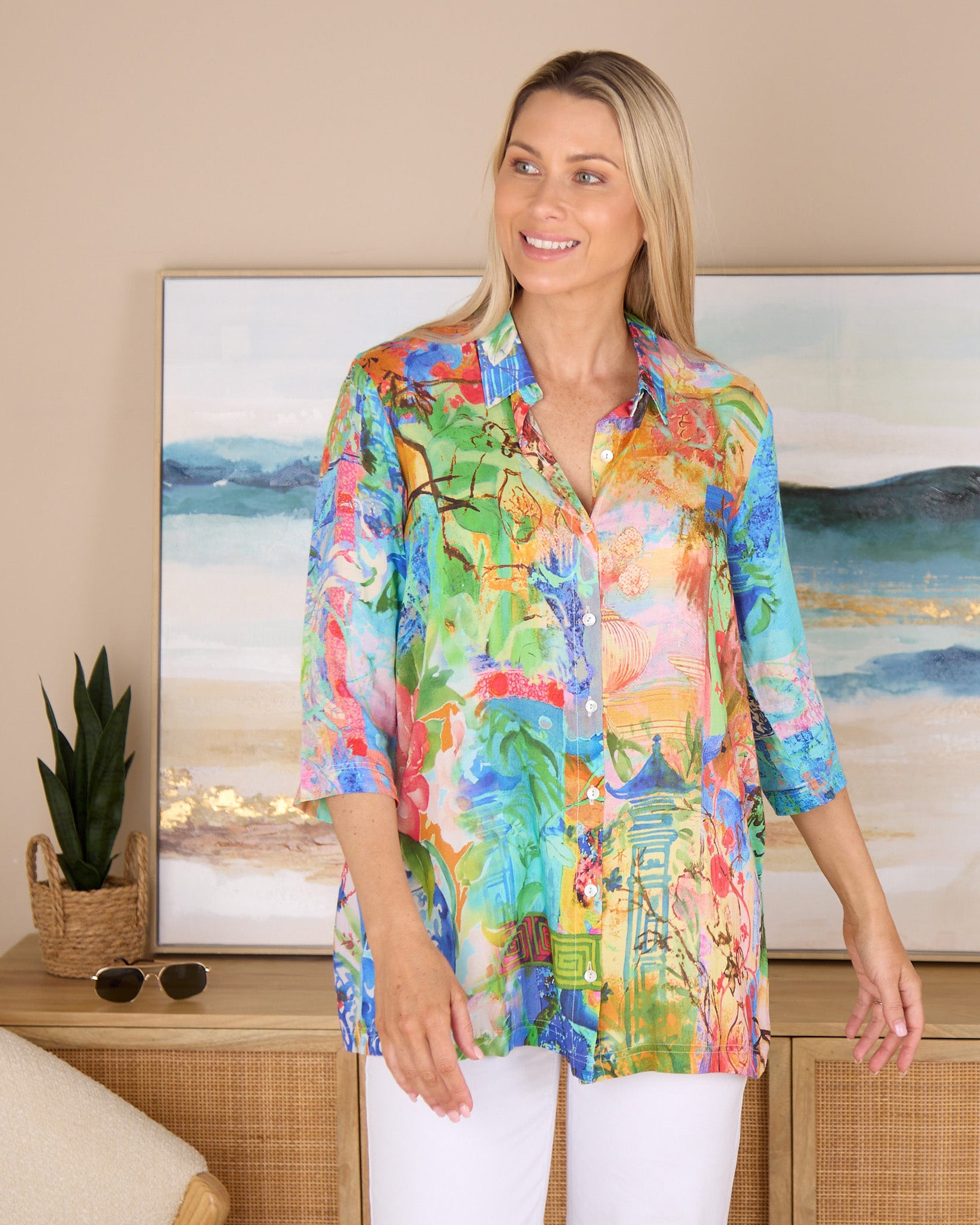 Make every day feel like a getaway with Orientique’s Digital Collared Shirt in the Mount Fuji print. A vivid collage of painterly botanicals, ceramics and travel motifs brings instant colour to your wardrobe, while the classic collar and button-through front add easy polish. The soft pure rayon drapes lightly with a relaxed, gently A-line silhouette that skims without clinging. Style with white jeans, linen crops or a slim skirt for lunches, holidays and weekend wandering.