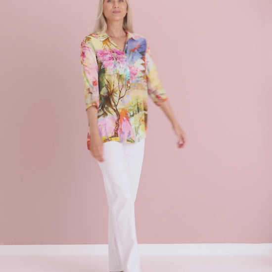 A wearable artwork for every day. Orientique’s Scenic Digital Collared Shirt showcases a painterly landscape in luminous pastels and brights, bringing instant lift to denim, white pants and neutral linens. The relaxed, gently A-line silhouette skims the hips for confident coverage, while the collared, button-through front keeps the look smart-casual. Light and airy in pure rayon, it drapes beautifully without clinging. Roll the 3/4 sleeves, add wedges or flats and you’re brunch-to-gallery ready, travel friendly and effortlessly polished.