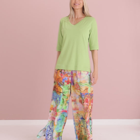 Escape to sunny days in the Digital Print Wide Leg Pants by Orientique in the Mount Fuji print. A vivid collage of painterly botanicals, ceramics and travel motifs brings instant colour to your wardrobe. The comfy high, elasticised waistband sits smoothly at the tummy and the wide leg drapes beautifully to elongate your silhouette. Style with a simple cami or the matching shirt for easy resort polish—perfect for lunches, holidays and warm evenings by the water.