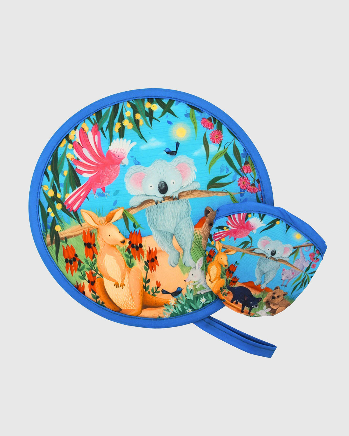 The whimsical design features a cute koala, a kangaroo, and a pink galah among Australian blossoms, bringing a smile to your face. It even comes with its own matching pouch, so it's always ready to go when you are.