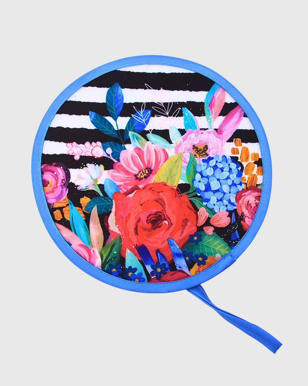 The eye-catching design combines vivid blooms with a modern striped backdrop, making it as fashionable as it is functional. A matching pouch keeps it tidy and protected between uses.