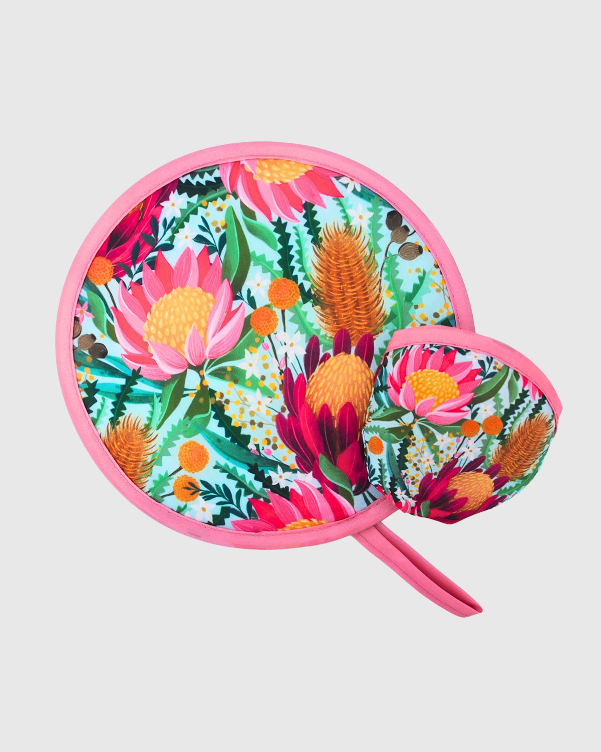 The striking design showcases bold pink proteas and native florals, making it as eye-catching as it is handy. Complete with a matching pouch, it stays protected and ready to go for your next outing.